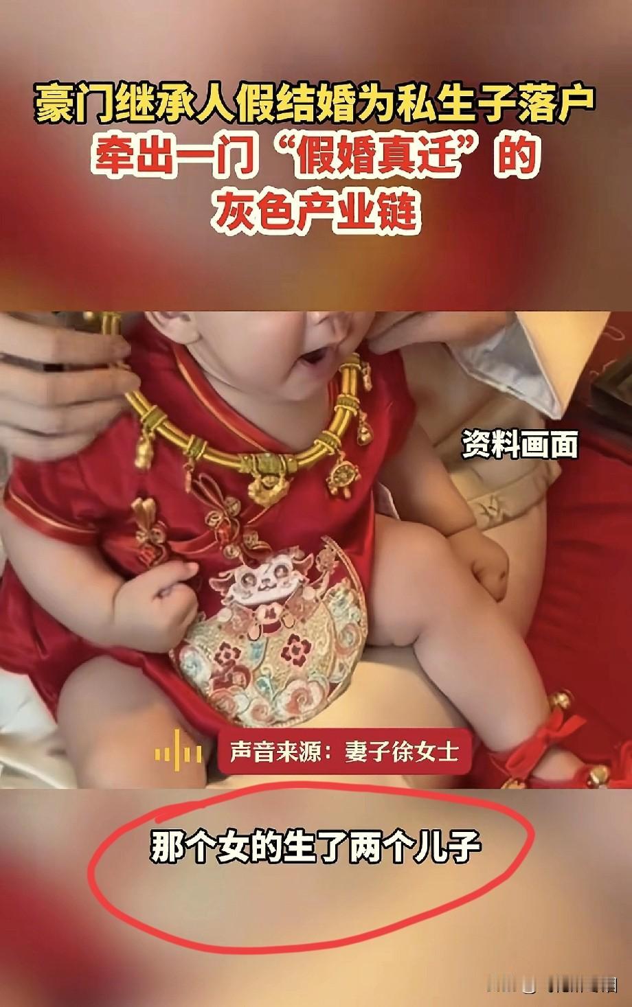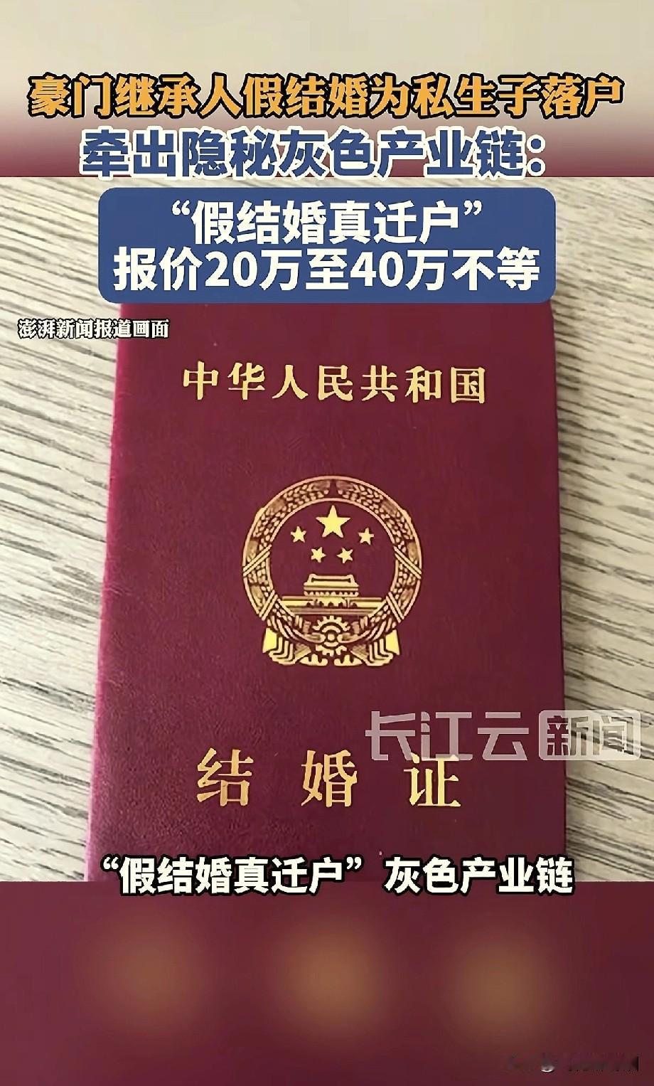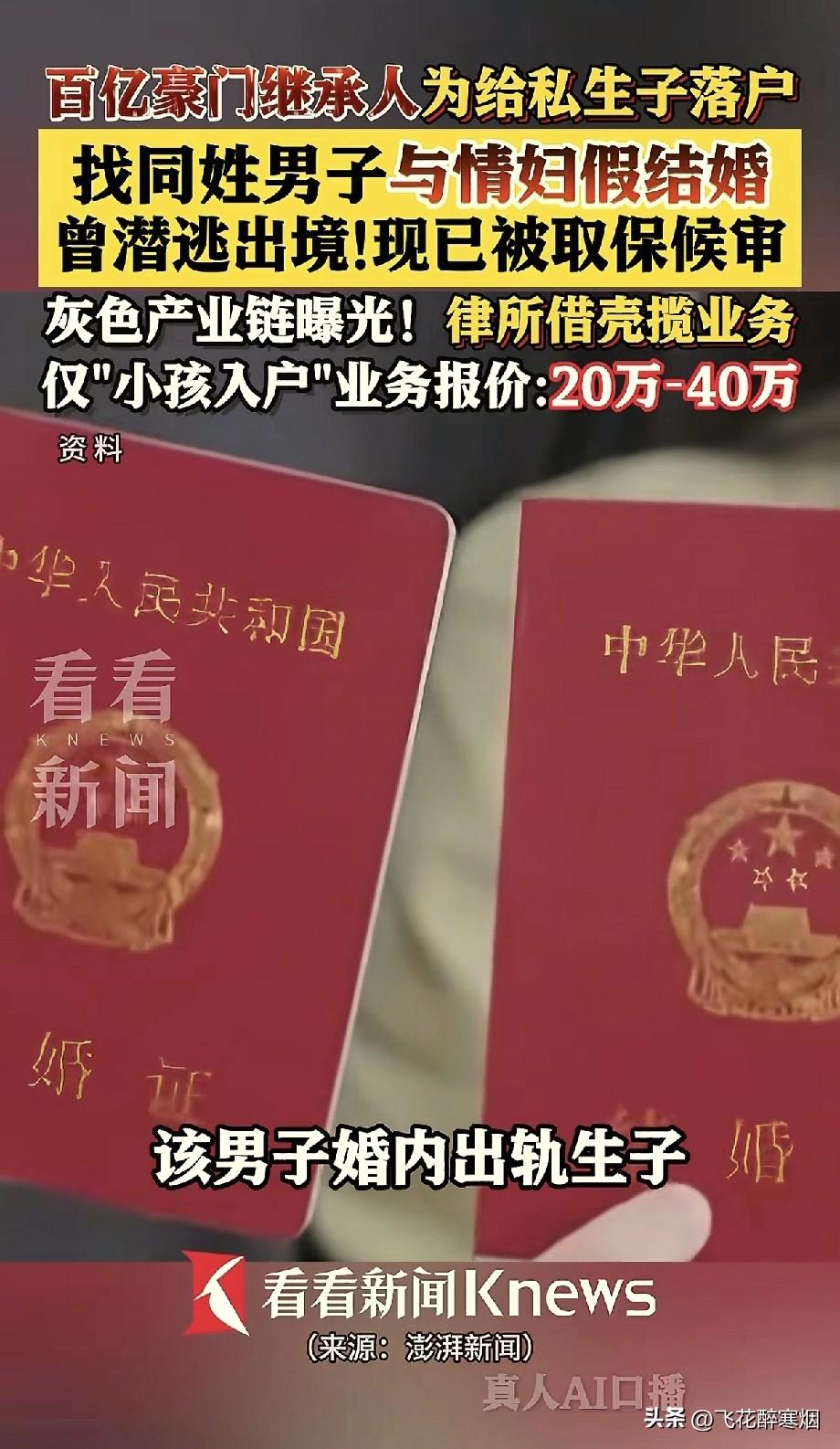 广东深圳,百亿豪门继承人,与情妇生了私生子,要给孩子上户口,他找了一个同姓的男子和他情妇假结婚,给孩子上户口,花了几十万,孩子一上户口,他的妻子就知道了这件事,她就以重婚罪报了警,结果牵出了一条隐秘灰色产业链。 一张深圳户口簿的"新增人口"栏,看起来平平无奇,背后却藏着20万到40万的明码标价。这不是什么都市传说,而是一个百亿身家的豪门继承人,为了给私生子洗白身份,真金白银砸出来的地下交易。 事情说起来也简单。这位少爷在外面有了情妇,情妇怀孕生子,孩子没户口就上不了学、分不了家产。对含着金钥匙出生的人来说,这怎么行? 中介给指了条路:花钱找个同姓男人,跟情妇演一出假结婚,孩子顺理成章落户,事成之后再离婚。整套流程设计得像工业流水线,结婚、落户、离婚,一个环节都不差。 正巧碰上个创业失败、欠了一屁股债的哥们。在他眼里,这买卖简直是天上掉馅饼:当个名义丈夫,领个证,户口办完就离婚,坐收几十万。不累人,没损耗,还能还清债务。钱给了,户口也办成了。少爷以为神不知鬼不觉,却低估了原配徐女士的底线。 徐女士这阔太当得憋屈。豪门生活是有了,但心怎么也捂不热。直到看见丈夫和外面那位的私生子,她才彻底看穿这段婚姻有多脏。 最刺激她的是,这私生子一旦在深圳扎根,按道理说,将来那一大笔遗产少不了这孩子的份。一个名不正言不顺的私生子,靠着落户"正名",以后还得和她抢地盘。 想到这儿,徐女士觉悟了:再这么忍气吞声下去,真得被人骑到头上。要翻身,就得让那帮人付出代价。 她选择了报警,起诉丈夫重婚。谁承想民警还没深入查呢,倒是先把帮人代办户口的"一条龙服务"给揪出来了。原来地底下有条完整的黑产链,专门帮这些见不得光的孩子洗白身份。 法律白纸黑字写得清楚:有配偶还乱跟人领证或者组建家庭的,最高能处两年。这位少爷和情妇生了娃,还通过这种偏门落户,在法律眼里已经是事实婚姻,该判就得判。他试图出国躲风头,结果照样被抓回来取保候审。 那个收钱办事的男哥们也得凉。他以为签了"合同"就有保障,实则这种违法合同打从一开始就是废纸一张。坏了规矩,到头来只会竹篮打水一场空。 这场用数十万堆砌的"身份游戏",最终证明了一件事:户口本不是商品,婚姻契约不是道具,法律红线更不是用钱就能跨越的栅栏。 当特权遇上法律,当算计遇上反击,所有自以为精密的设计,都会像泡沫一样,一戳就破。