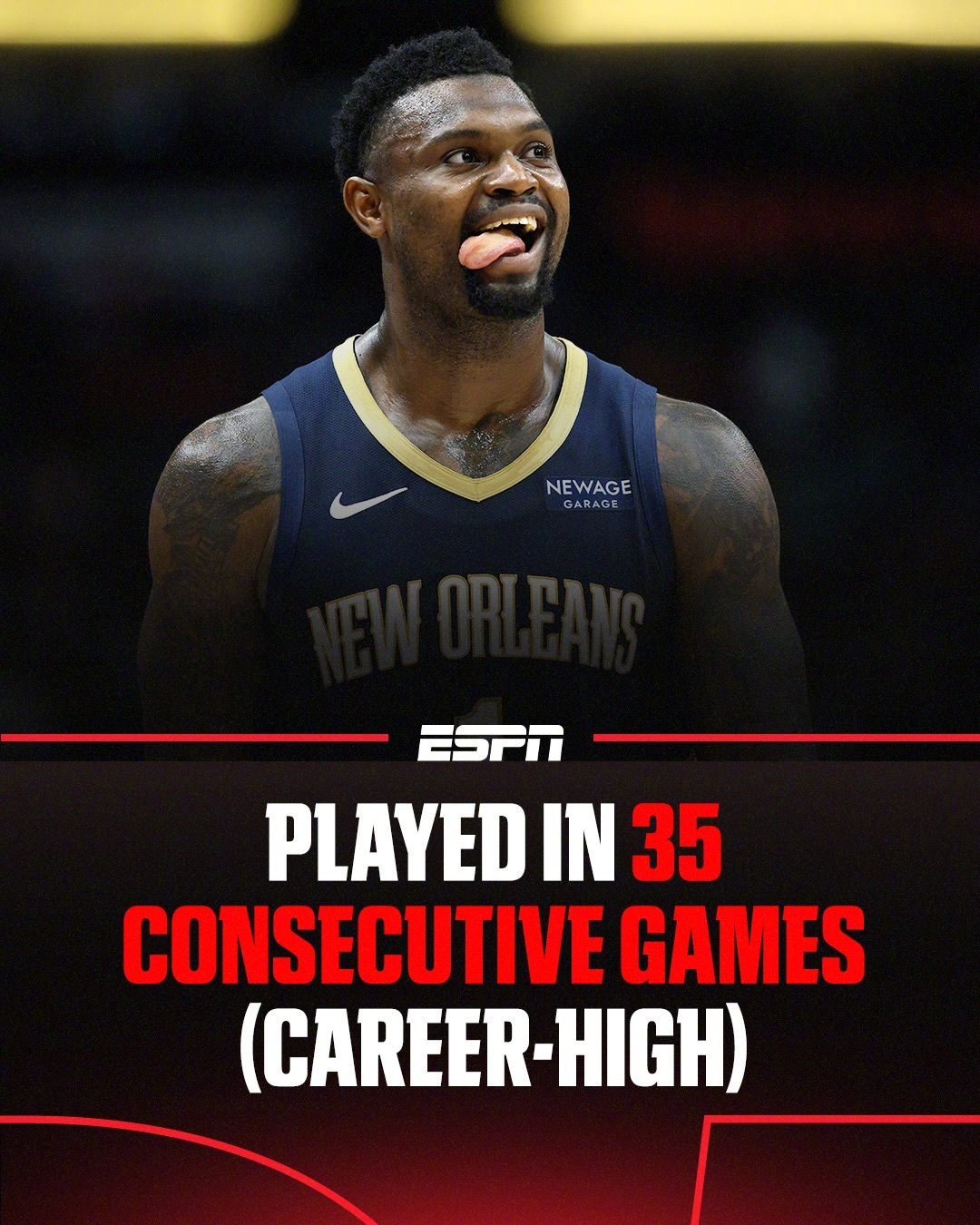 锡安已经连续出场35场,这是他生涯最长的一次连续出场纪录。运动表现训练师Kris Chrisp说锡安为了保持健康付出了很多:“大多数人只看到锡安的扣篮,很少人看到他背后的付出。”