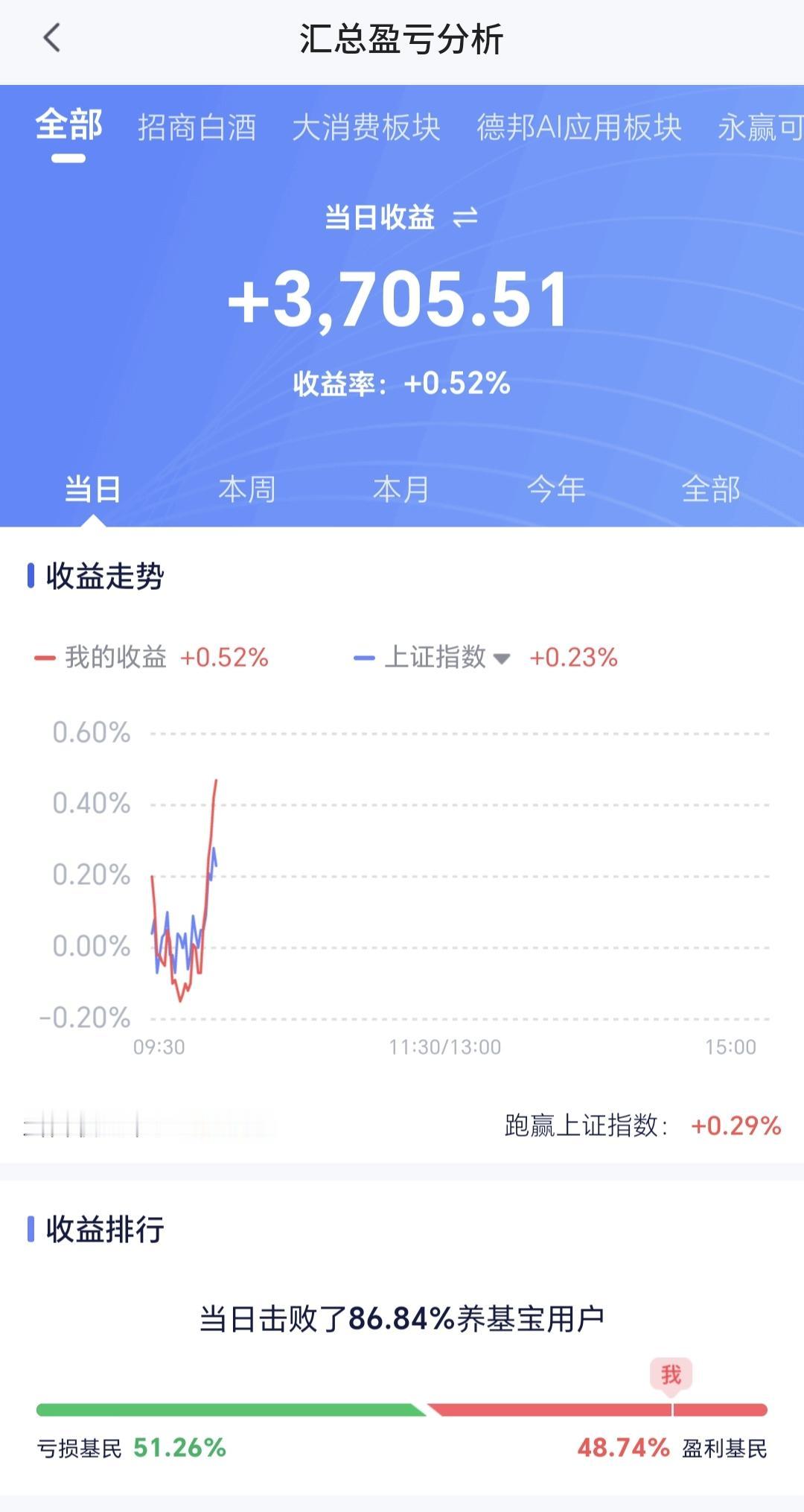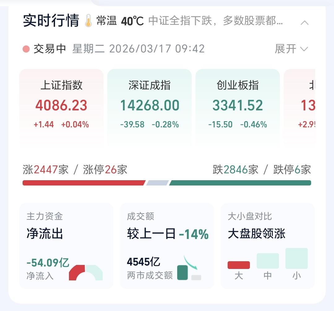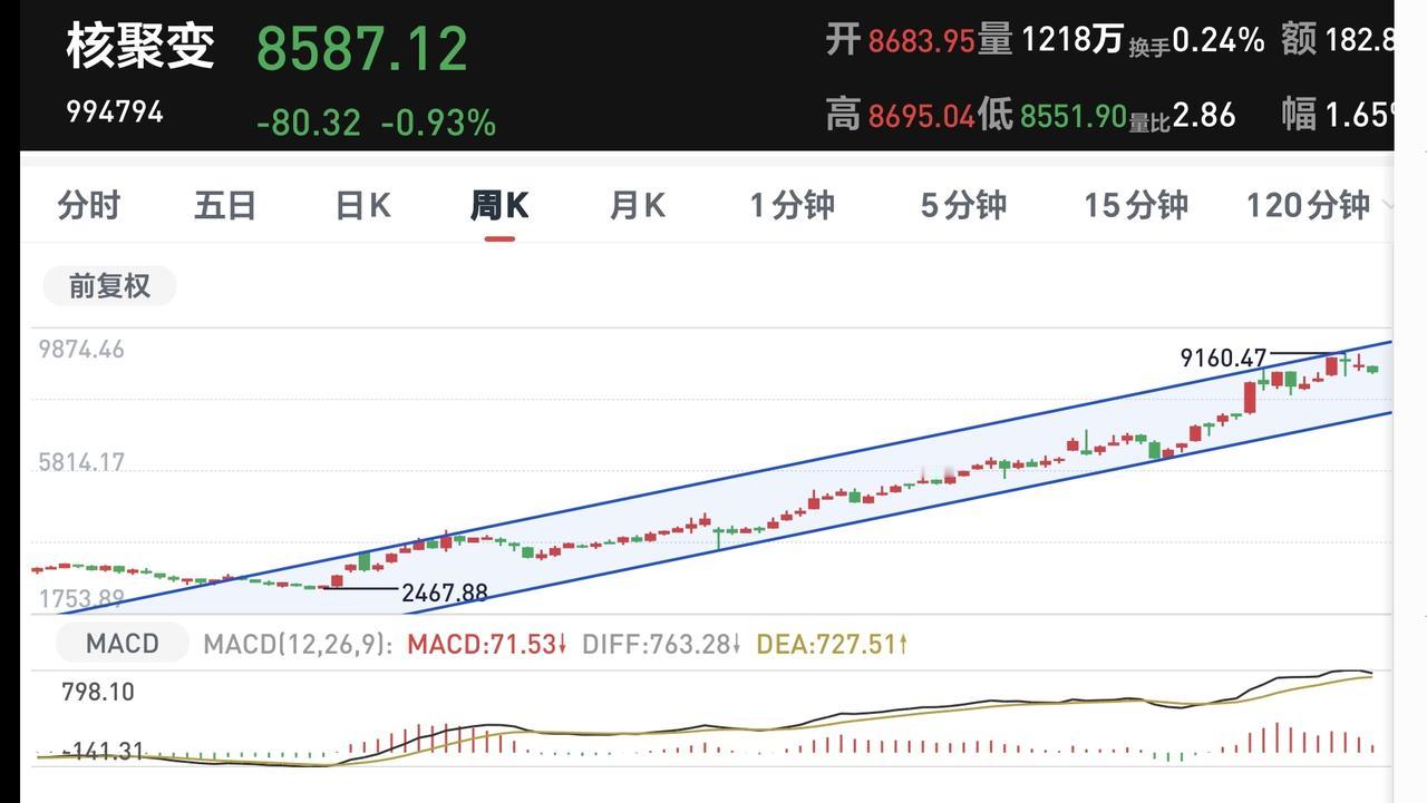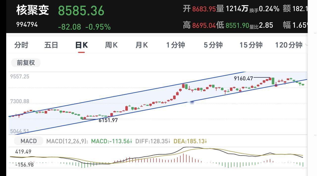基金:市场指数全线上涨,但存在两个隐患 今天市场高开,三大指数都是高开,创业板指开盘上涨了0.85%,开于3385点,上证指数开盘上涨了0.04%,开于4086点。 开盘以后指数小幅度震荡,黄色线在蓝色线下方,两条线之间的敞口比较大,两市累计成交4545亿,相比于昨天同期缩量了14%,市场上涨2447家,下跌2846家,上涨家数少于下跌家数,涨停26家,跌停6家,主力资金净流出54亿。 整个市场主力资金净流入最多的三个板块是:光伏设备板块,新能源板块,esg板块,主力资金净流出最多的三个板块是:通信板块,国企板块,5G板块。 整个市场上涨幅度最大的三个板块是:交通运输板块,房地产板块,钢铁板块,下跌幅度最大的三个板块是:通信板块,cpo板块,可控核聚变板块。 可控核聚变板块,现在盘中估值下跌了1.57%,是连续第五个交易日下跌,持有人数在所有板块当中排名第25位。 可控核聚变板块日线级别处于上涨趋势破位中,上周五下跌跌破了日线级别上涨通道的下轨线,短线持有的人需要注意风险。 可控核聚变板块周线级别处于上涨通道中,小幅度的涨跌都改变不了周线级别的上涨趋势,长线持有的人可以继续持有,周线级别上涨通道的下轨线是长线持有者的持有条件。 电网设备板块盘中估值下跌了1.26%,是连续第五个交易日下跌,持有人数在所有板块当中排名第62位。 电网设备板块昨天下跌跌破了日线级别上涨通道的下轨线,今天是继续下跌。近期观察这个破位是不是有效破位,如果是有效破位日线级别的上涨趋势,短线持有的人需要注意风险。 电网设备板块周线级别处于上涨通道中,距离上涨通道的下轨线比较远,小幅度的下跌都改变不了周线级别的上涨趋势,长线持有的人可以继续持有。 现在三大指数已经全部翻红,但两个隐患都没有解决,一个就是黄色线在蓝色线下方,还有一个是成交量处于萎缩状态,这样的上涨容易冲高回落,继续观察排名的走势,我们的操作需要根据真实的走势来决定,我们的操作并不是根据预测的走势来决定。 持有基金现在盘中估值上涨了3705元,盈利金额最大的三个板块是:证券板块,创新药板块,大消费板块,亏损金额最大的三个板块是:芯片半导体板块,新进制造板块,5G板块。 花1秒钟点赞,花30秒钟评论,就是对我最大的支持,谢谢大家的支持。
