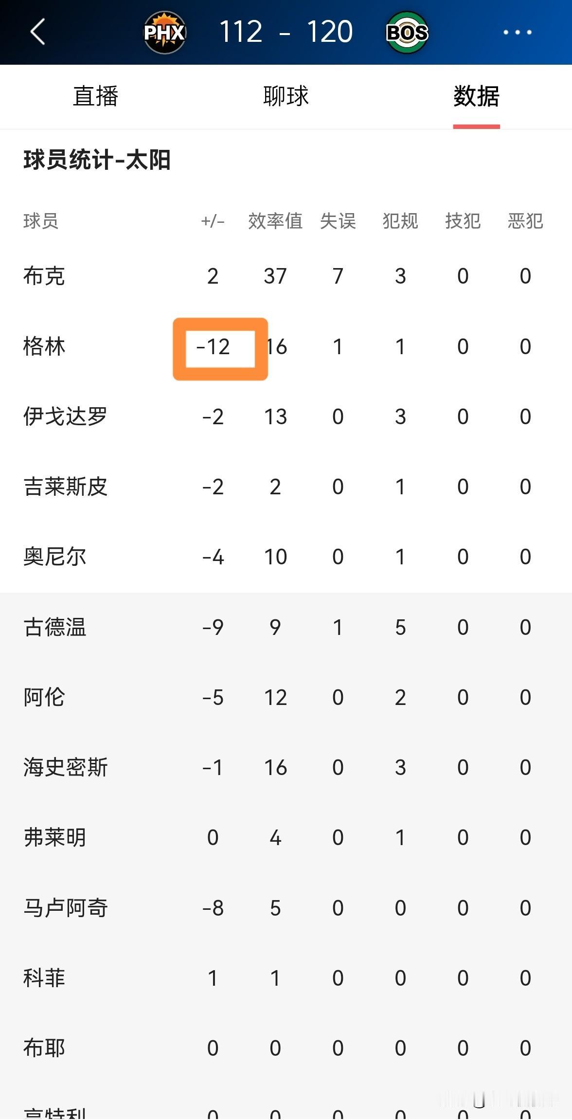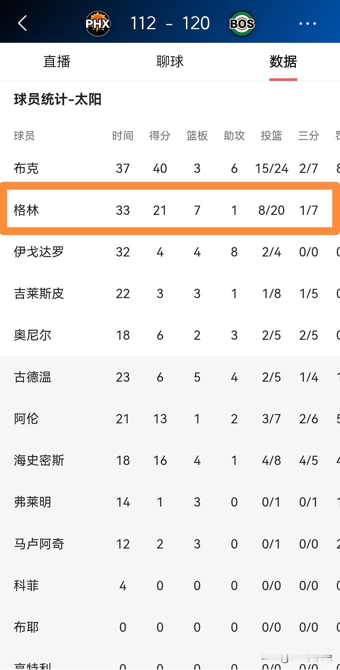 太阳二当家杰伦-格林终于拉胯了!在今天太阳客场以112:120不敌凯尔特人的比赛中,杰伦-格林未能延续最近的出色状态,终于拉胯了一回。 全场比赛下来,杰伦-格林首发出战33分钟,投篮20中8,其中三分球7中1、罚球4中4非常低效的得到21分,他的场上正负值为球队最低的-12。 坦白说,如果杰伦-格林想要成为一名超级巨星,那么他必须提高自己在进攻端的稳定性,不然的话杰伦-格林充其量只能成为一名全明星球员。