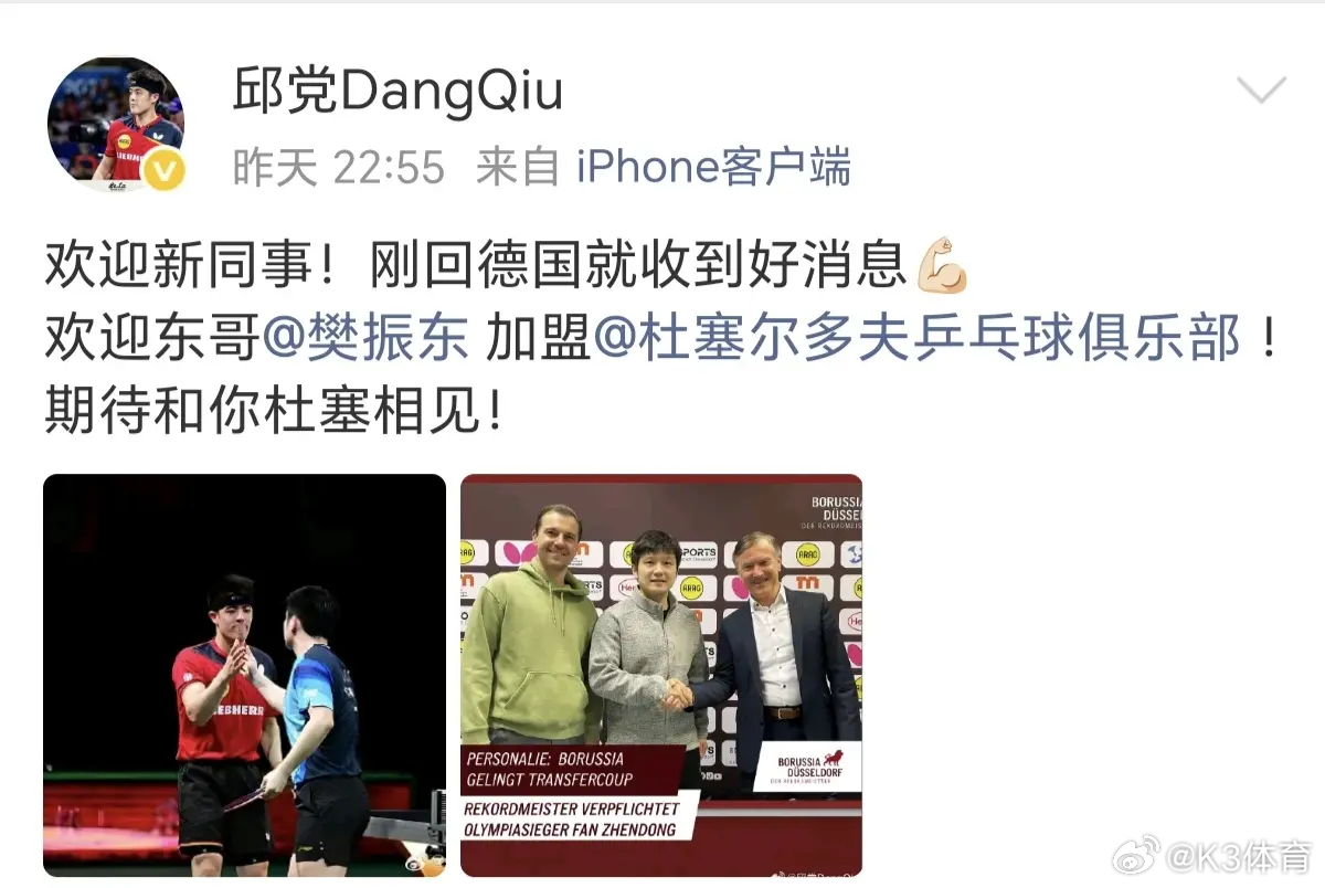 邱党直呼樊振东为新同事官宣!樊振东下赛季确认加盟德甲豪门杜塞尔多夫俱乐部欢迎东哥