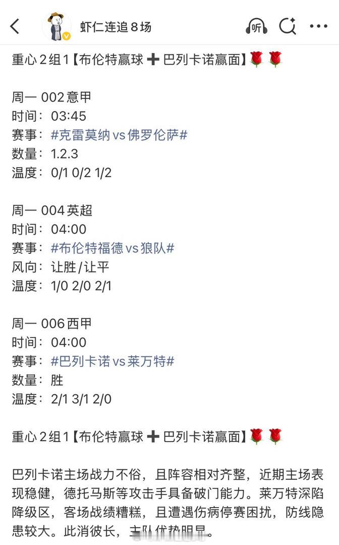 昨天的比赛跟预期相比,确实有失水准,不过今天的早场咱们绝对不会放过!🔝👗👀重❤️布伦特福德vs狼队巴列卡诺vs莱万特佛罗伦萨