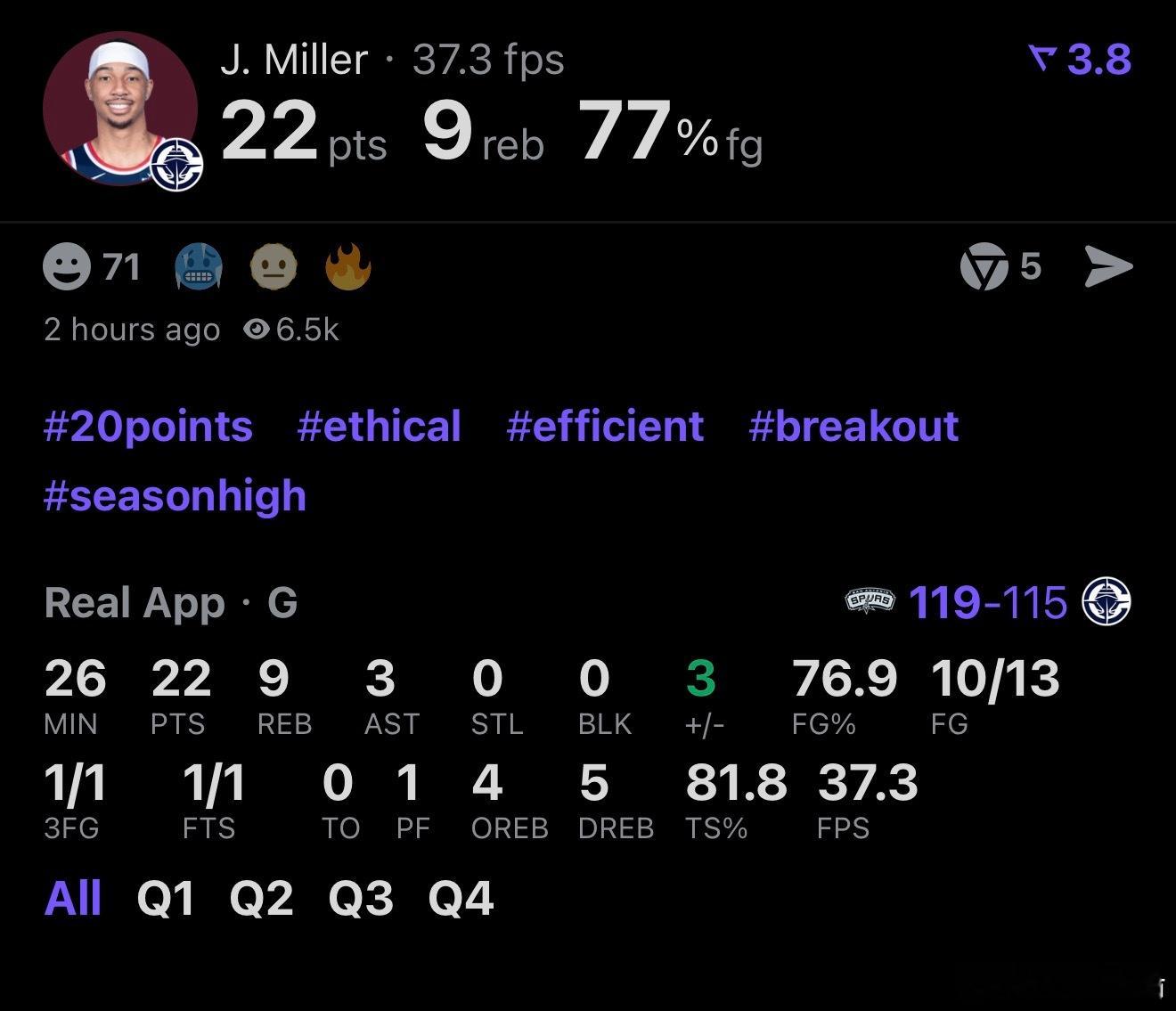 米勒本场拿到22分,追平生涯单场得分纪录,生涯第5次拿到20+。