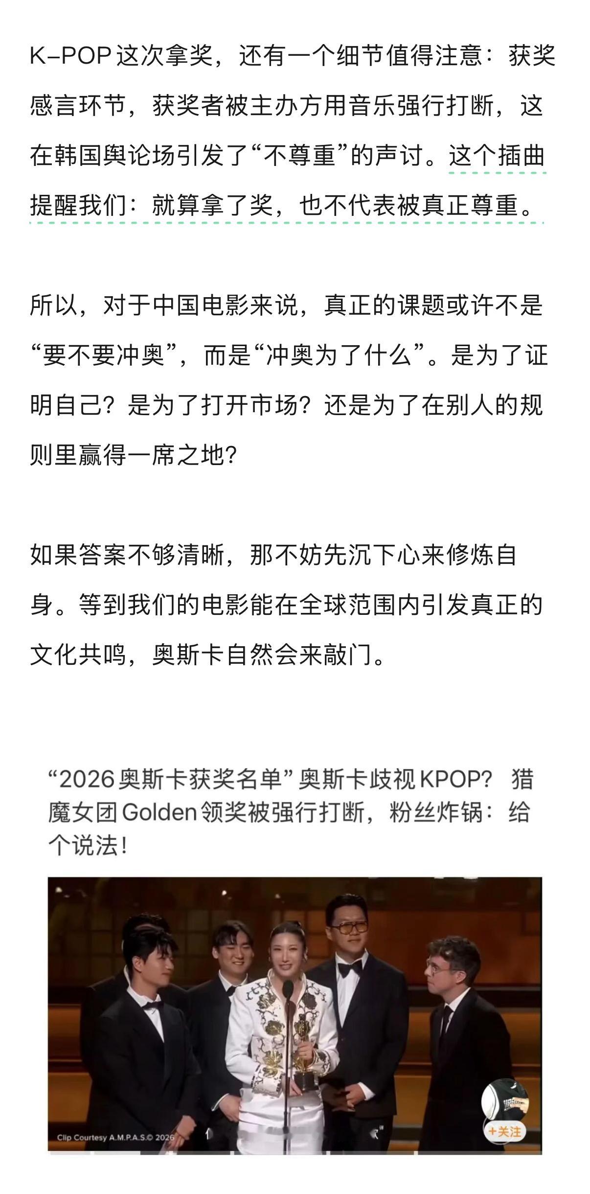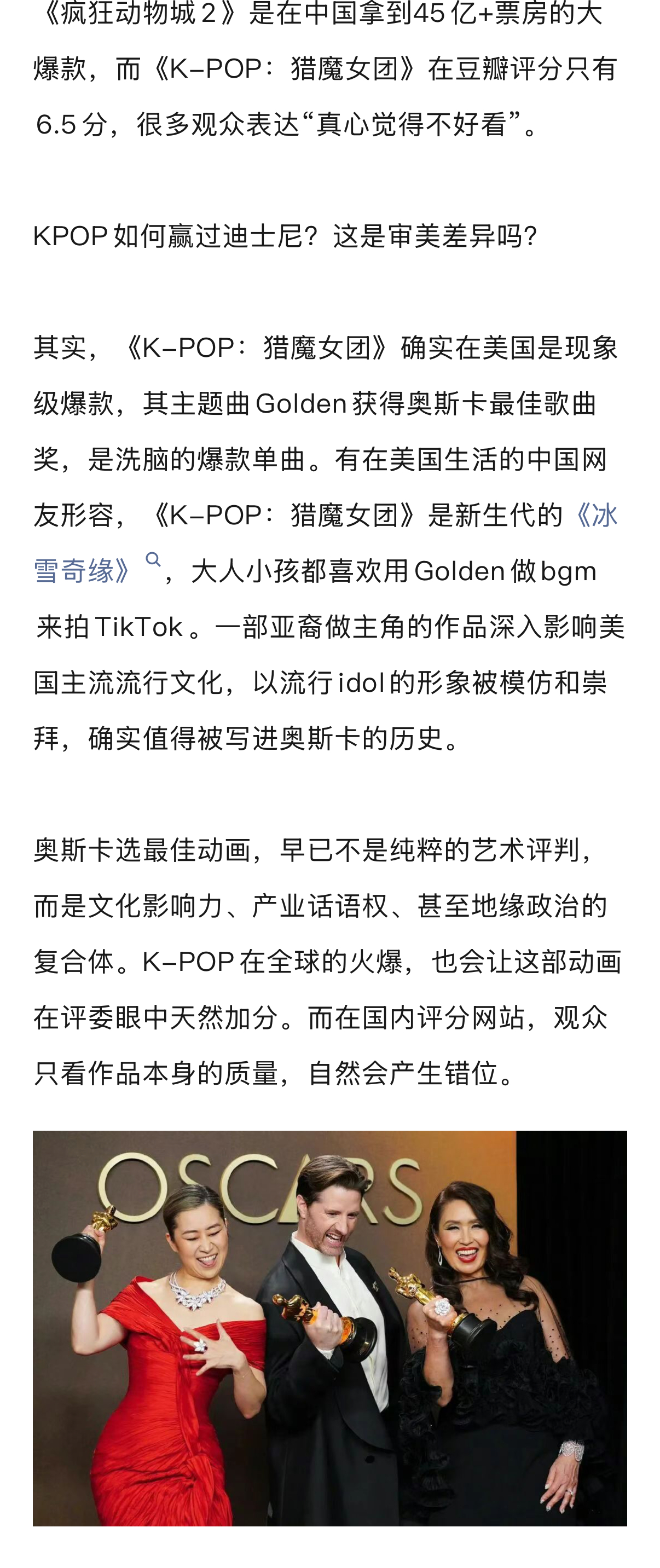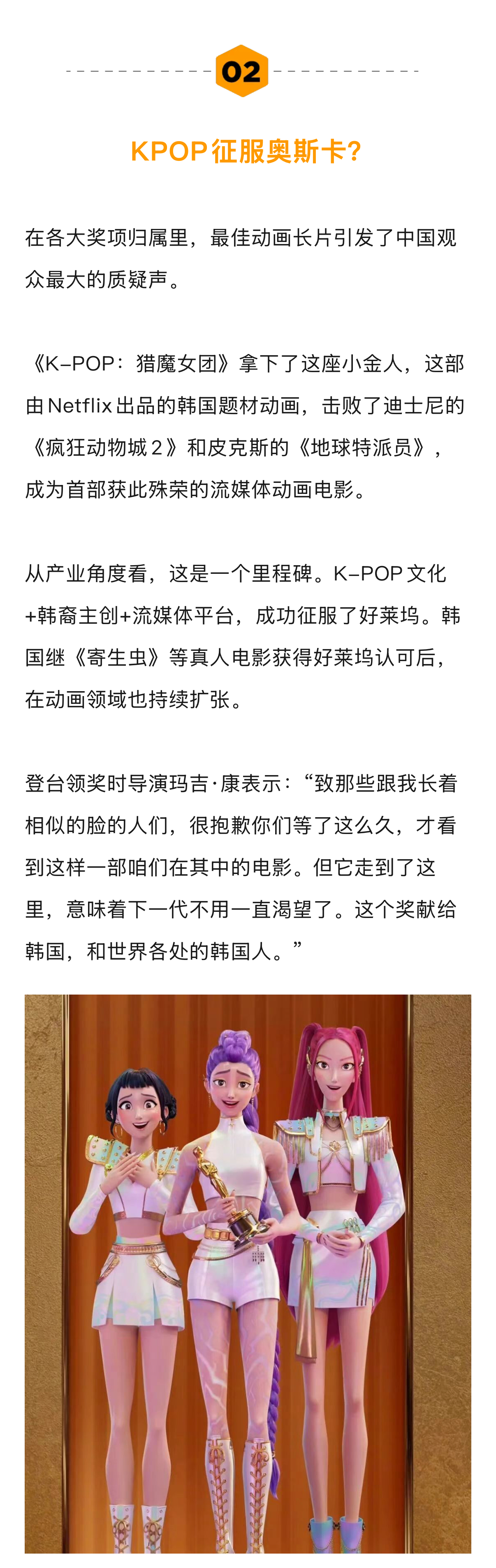 在各大奖项归属里,最佳动画长片引发了中国观众最大的质疑声。《K-POP:猎魔女团》击败了迪士尼的《疯狂动物城2》和皮克斯的《地球特派员》,成为首部获此殊荣的流媒体动画电影。从产业角度看,这是一个里程碑。K-POP文化+韩裔主创+流媒体平台,成功征服了好莱坞。韩国继《寄生虫》等真人电影获得好莱坞认可后,在动画领域也持续扩张。