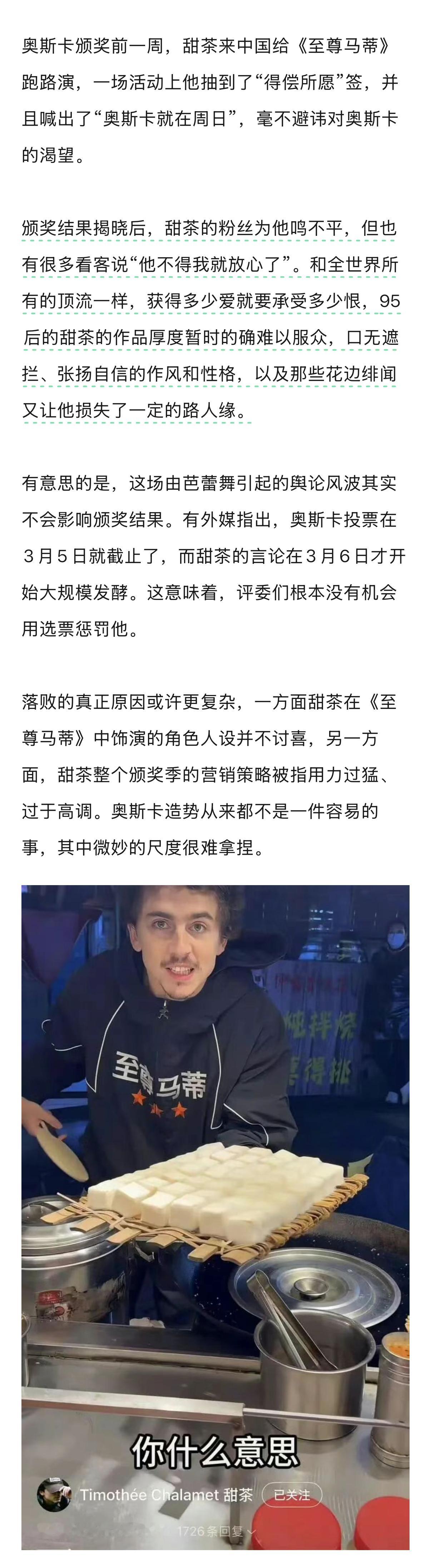 奥斯卡颁奖前一周,甜茶来中国给《至尊马蒂》跑路演,一场活动上他抽到了“得偿所愿”签,并且喊出了“奥斯卡就在周日”,毫不避讳对奥斯卡的渴望。颁奖结果揭晓后,甜茶的粉丝为他鸣不平,但也有很多看客说“他不得我就放心了”…由此可见其路人缘。
