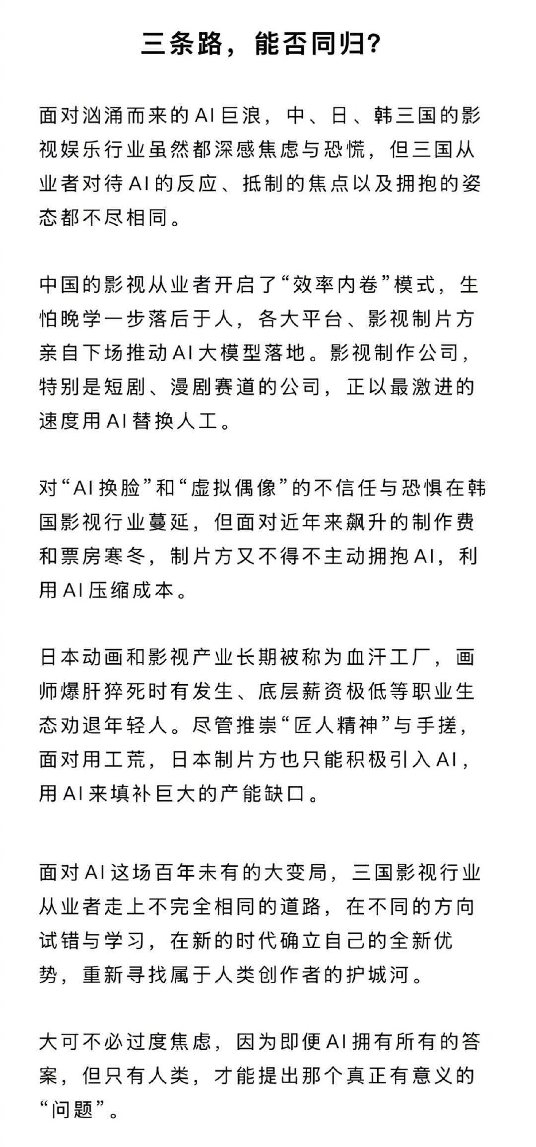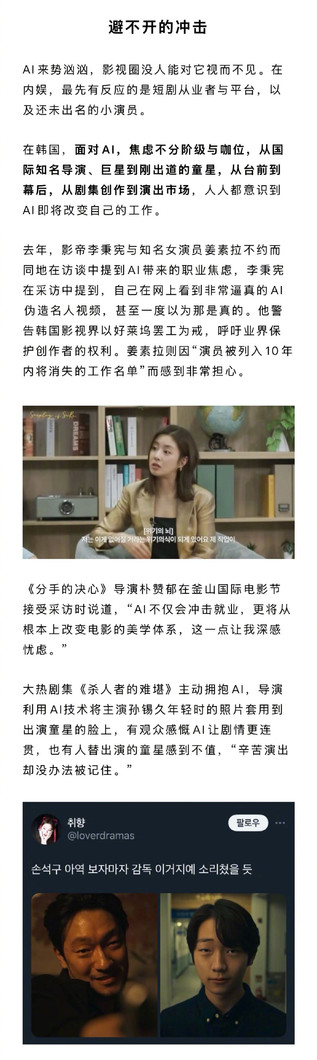 李秉宪姜素拉谈AI职业焦虑AI特效韩国观众不买账面对AI,最激进的尝鲜者居然不是内娱?韩国尝鲜AI特效、AI综艺却遇票房口碑滑铁卢,日本用AI续写经典漫画,内娱加速AI落地,掀起效率内卷。这场技术变革中,人类创作是否还有独特价值,成为行业探讨的核心,也是人类面对AI的信心。