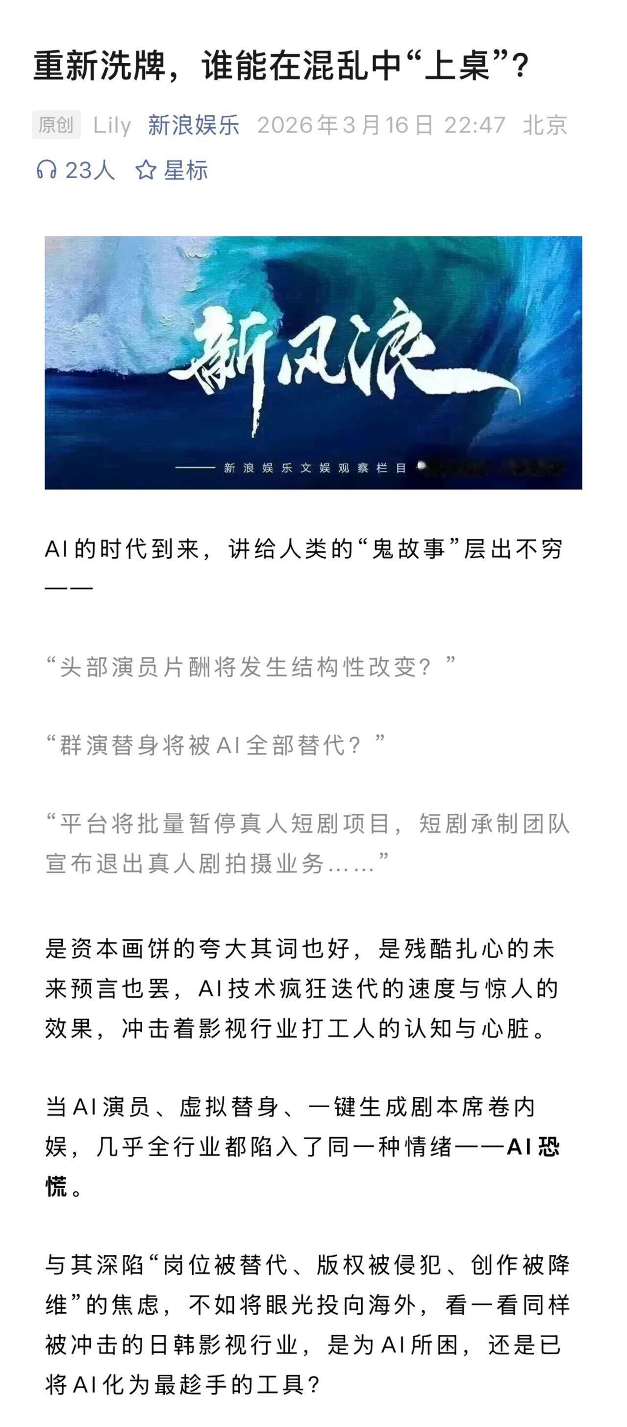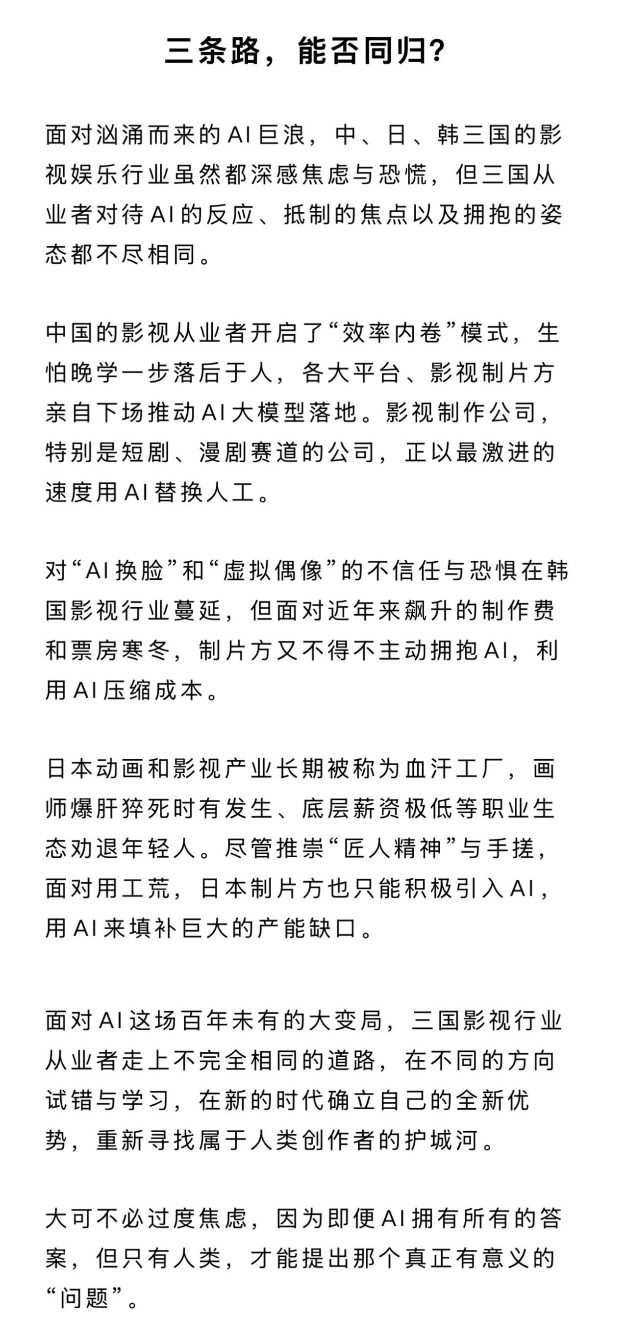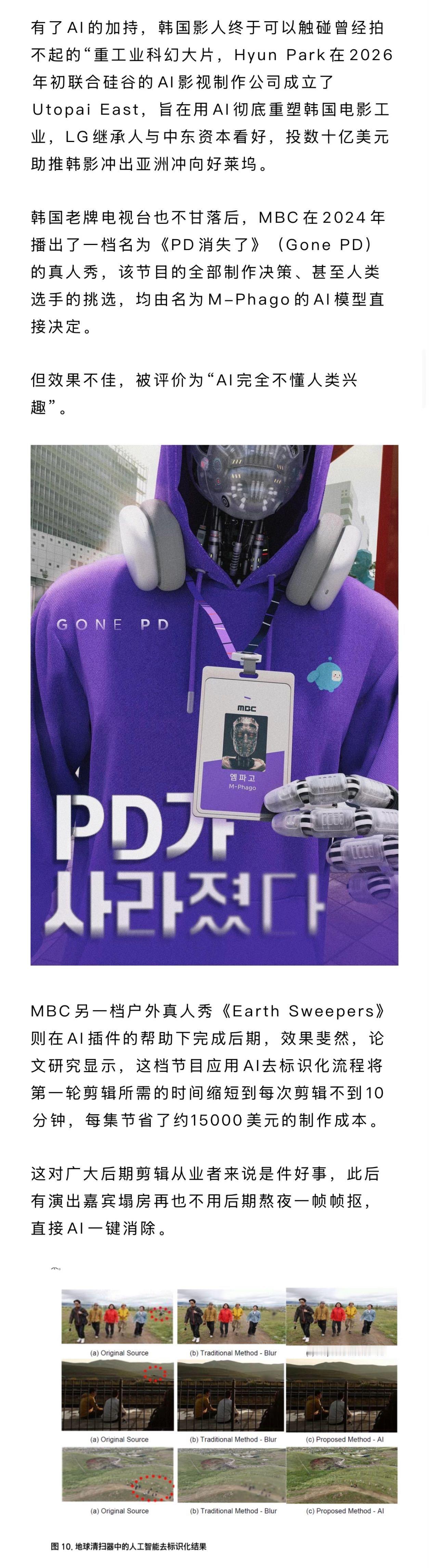 李秉宪姜素拉谈AI职业焦虑AI特效韩国观众不买账 从AI生成剧到虚拟偶像吸金,影视行业的AI时代已来临。韩国影视行业在抵制与拥抱间摇摆,AI制作虽提效却难获观众认可;日本坚持手搓,最多让AI成为辅助;内娱全力推进AI落地,韩国一边焦虑一边拥抱,AI开启影视行业全新的竞争格局。