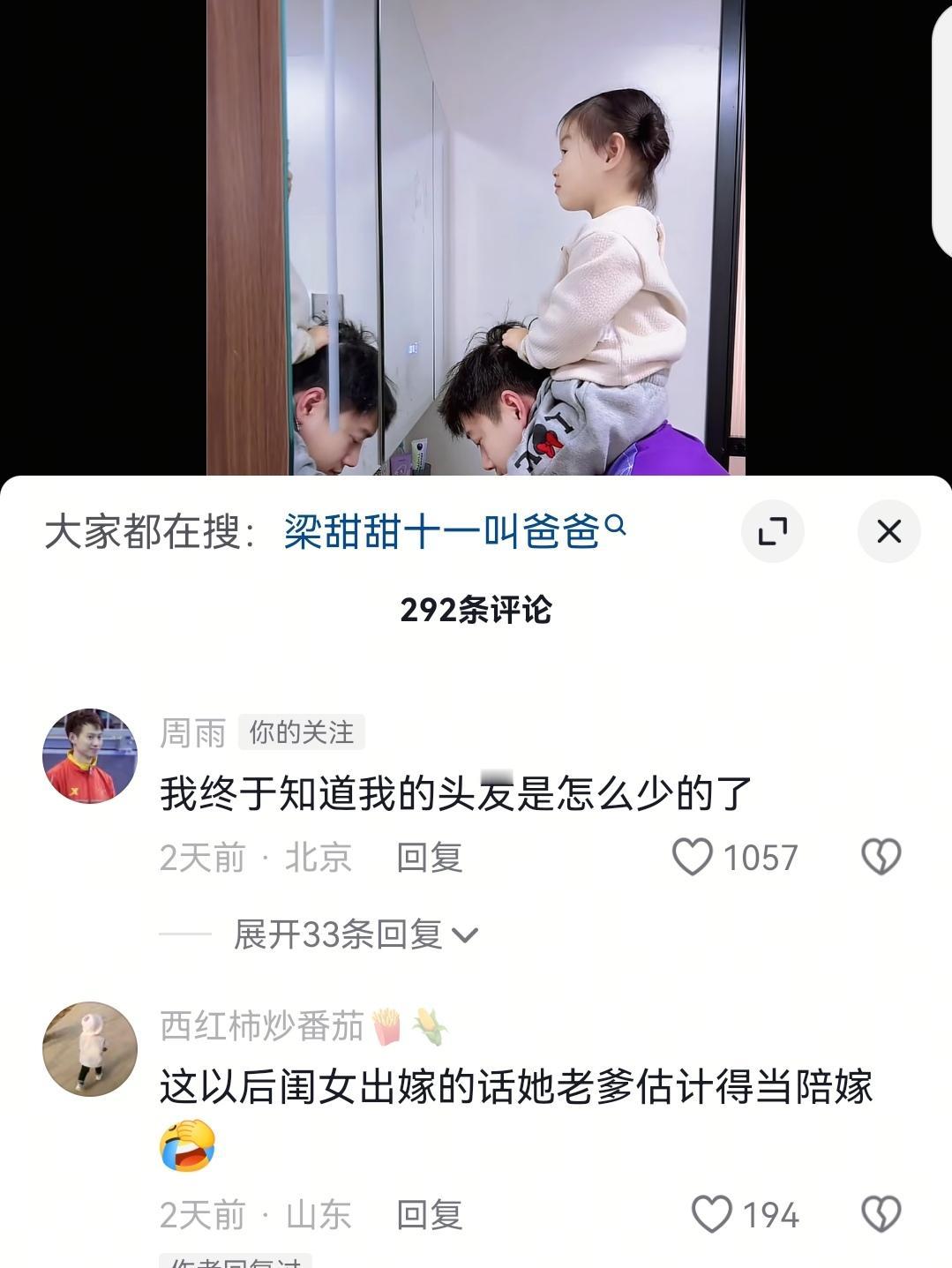 周雨说,终于知道我的头发是怎么少的了。都说女儿是爸爸的小棉袄,周雨家的小棉袄又漏风了。 周雨用了别致的方式给女儿洗脚,小十一骑在爸爸的肩头,双手揪着爸爸的头发,女儿奴爸爸周雨低头用温水给女儿冲洗小脚,小十一的妈妈妮娜也负责拍下这温暖和谐的一幕。 父母对子女的爱从来不求回报,周雨对自己的小模板似的女儿更是爱不释手,小十一坐在爸爸的肩头俨然就是一个小公主,老父亲周雨正细心地搓洗着女儿的小脚丫。