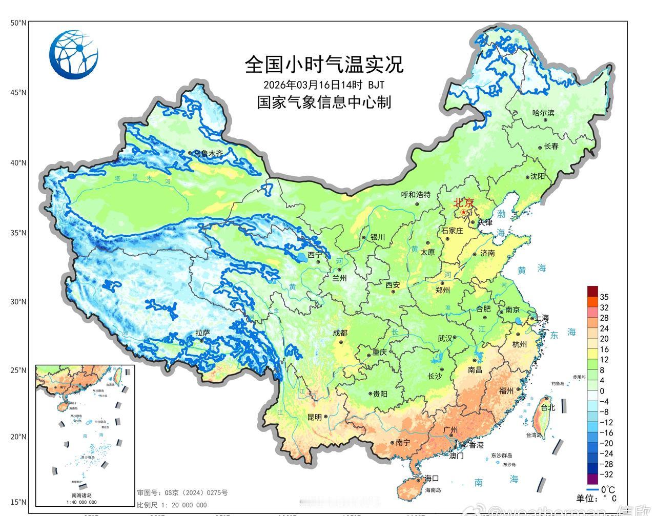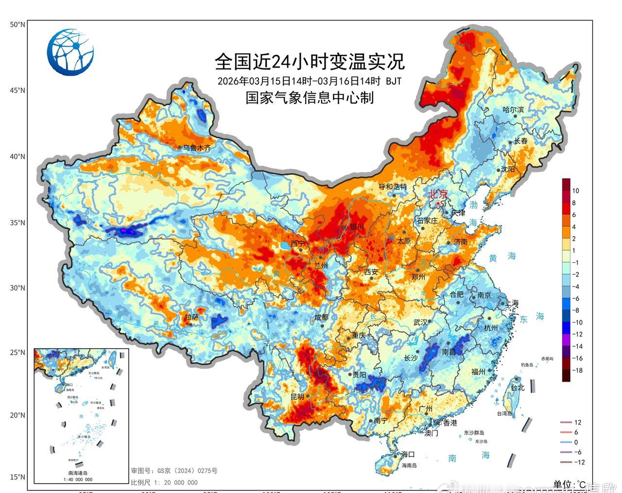 【气温南北倒挂】今天北方大多晴天,气温回升,贵州到江南以及江淮等地,有云层遮盖,气温下滑。这使得下午华北一带的气温比长江流域多地还高。北京超过了14℃,而武汉和长沙还不到10℃。