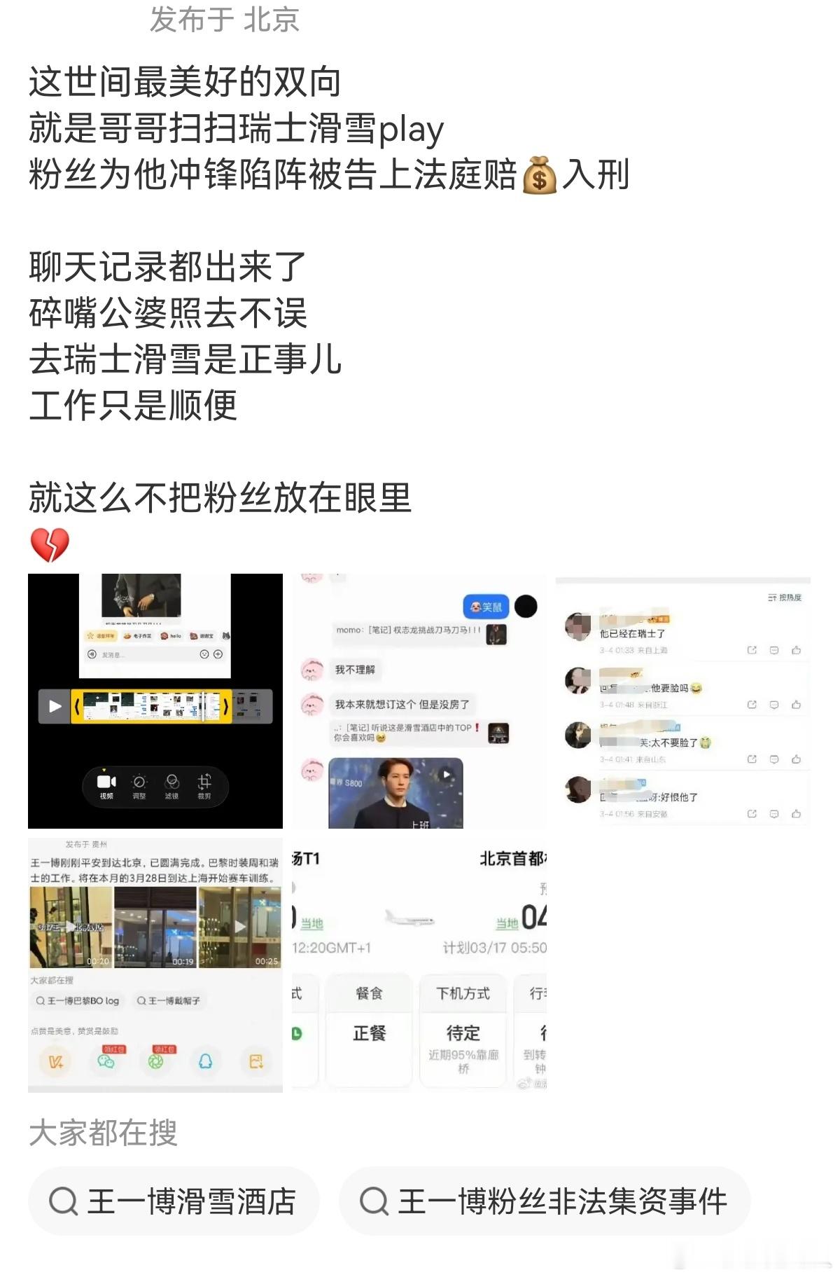 用户10xxx37 2026-03-18 01:09 王一博去瑞士(涉及法国霞慕尼的品牌合作、拍摄等事宜)小蝶蝶你就造谣吧。不信谣不传谣,不被xiao家营xiao号山蝶蝶带节奏。★★编造綦博聊天记录,1️⃣官方已定论:设计构陷,内容全伪造2️⃣构陷者身份明确 3️⃣源头已提告,持续zy的等着收传票