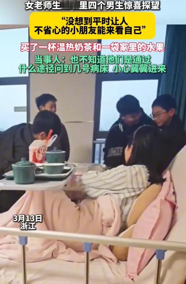 泪目了!浙江嘉兴,一名女老师怀孕生子后在医院病房休息,没想到,班里四名男生竟然悄悄找了过来,而这四名男生,既不是班里的干部,也不是学习成绩好的孩子,反倒是平时最不省心的几个,网友:成绩永远不是衡量一个人的标准。 二月的嘉兴,寒意还没完全褪去,医院的病房里大多是安安静静的,那位刚生完孩子的女老师,正趁着空闲好好休息,恢复体力。 谁也没料到,病房门会被悄悄推开,进来的是四个半大的男孩,正是她班里的学生。 说起来,这四个男孩在班里真的不算让人省心的类型,既不是老师常夸的班干部,也不是成绩拔尖的尖子生,反倒是平时上课爱走神、作业爱拖延,时不时就要被老师叫到办公室提醒几句的孩子。 不管是老师还是同学,恐怕都不会想到,会是他们主动来看望刚生产的老师。 没人知道他们是从哪里打听来老师住院的消息,只知道他们凭着老师平时随口提过的一句医院名字,没跟家长说,就自发凑到了一起,组成了一个小小的探望小组。 他们手里的钱不多,都是自己平时省下来的零花钱,凑在一起买了一杯热奶茶,还有两斤水果,算不上贵重,却看得出来格外用心。 为了找到老师的病房,他们在医院里一趟趟地问医护人员,一层一层地找,没有丝毫不耐烦,就凭着一股韧劲,终于找到了地方。 推开门的时候,平时爱吵爱闹的几个男孩,一下子变得拘谨起来,声音压得特别小,生怕打扰到老师休息,那份小心翼翼,和平时在课堂上的调皮模样判若两人。 他们没有说什么华丽的祝福,只是安安静静地坐在床边,跟老师念叨着班里的一些小事,说说谁上课又调皮了,谁的作业有进步了,絮絮叨叨的,都是些不起眼的日常,却成了最能让老师安心的话语。 他们在用自己笨拙的方式告诉老师,班里一切都好,让她不用惦记,安心养病。 这件事传到网上后,很多网友都颇有感触,大家说得最多的,就是成绩从来都不是衡量一个人的唯一标准。 我们总习惯用分数去评判一个孩子的好坏,觉得成绩好就是好孩子,成绩差就不值得被肯定,可这四个男孩用实际行动告诉我们,善良、懂得感恩、懂得体谅他人,这些不被分数衡量的品质,才更珍贵。 老师平时对他们的关心和教导,没有体现在试卷的分数上,却悄悄刻在了他们的心里,让他们在老师最需要陪伴的时候,主动站了出来。 这份纯粹的心意,比任何满分试卷都更让人动容,毕竟,成绩或许能决定一时的好坏,但骨子里的善良和温暖,才能陪伴一个人一辈子。 大家对此怎么看?欢迎评论区留下您的观点!