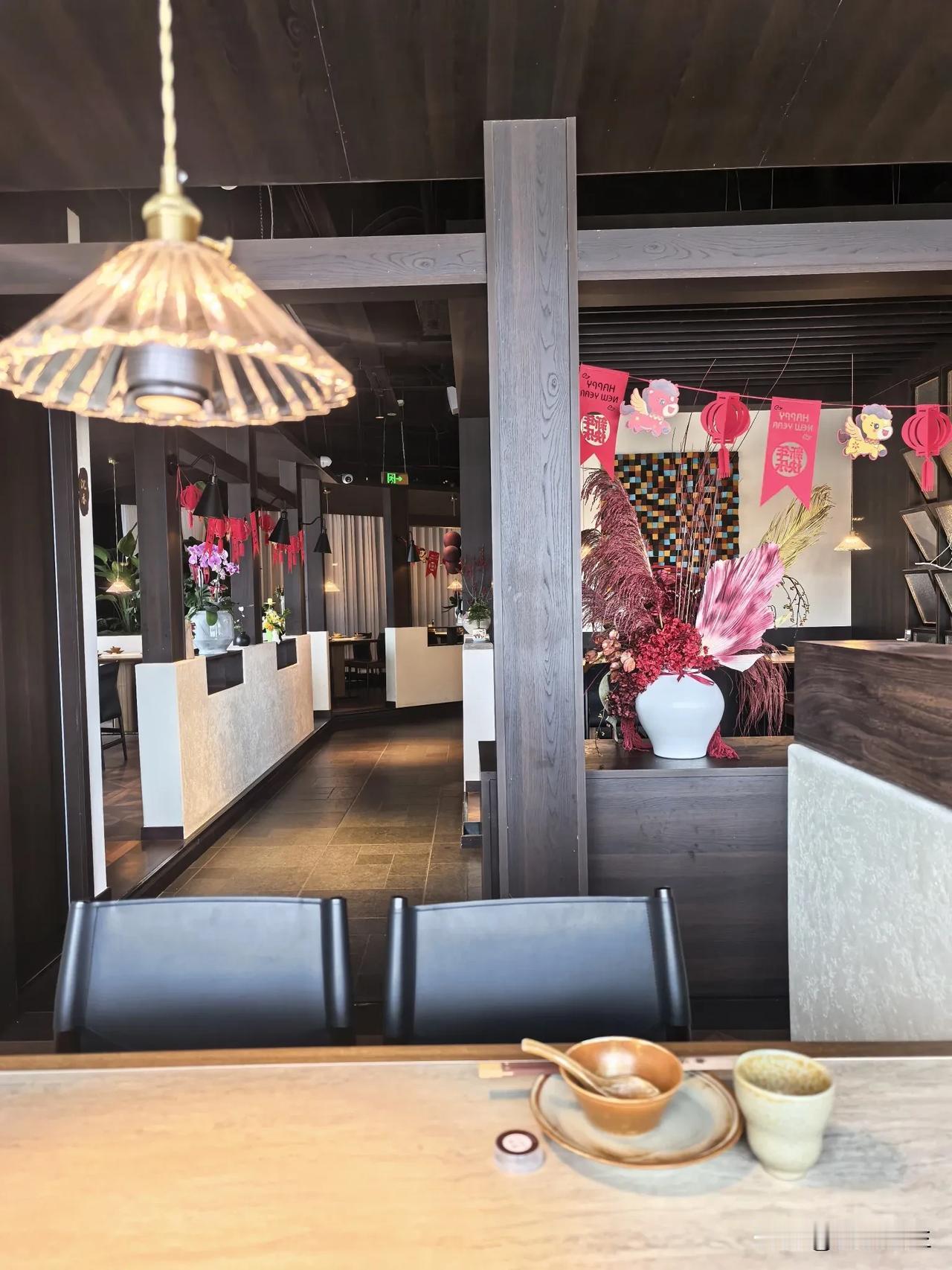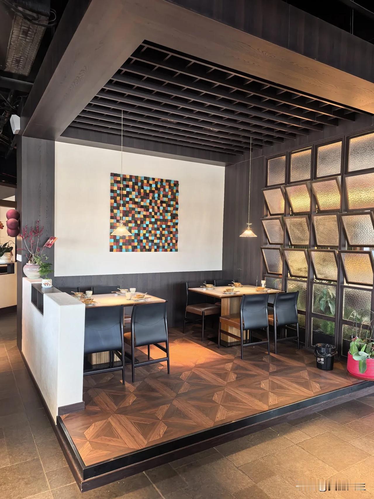 煮海,橙黑撞色的门头视觉冲击力强,张扬的门头与克制的内部形成情绪缓冲,瞬间从喧嚣转入宁静。室内黑白为主,木色地板中和冷感,光影营造雅致静谧的用餐环境
