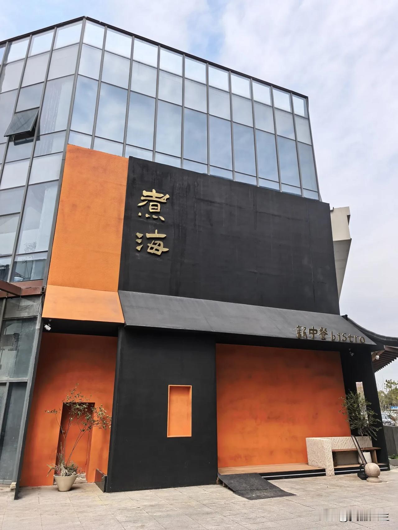 煮海,橙黑撞色的门头视觉冲击力强,张扬的门头与克制的内部形成情绪缓冲,瞬间从喧嚣