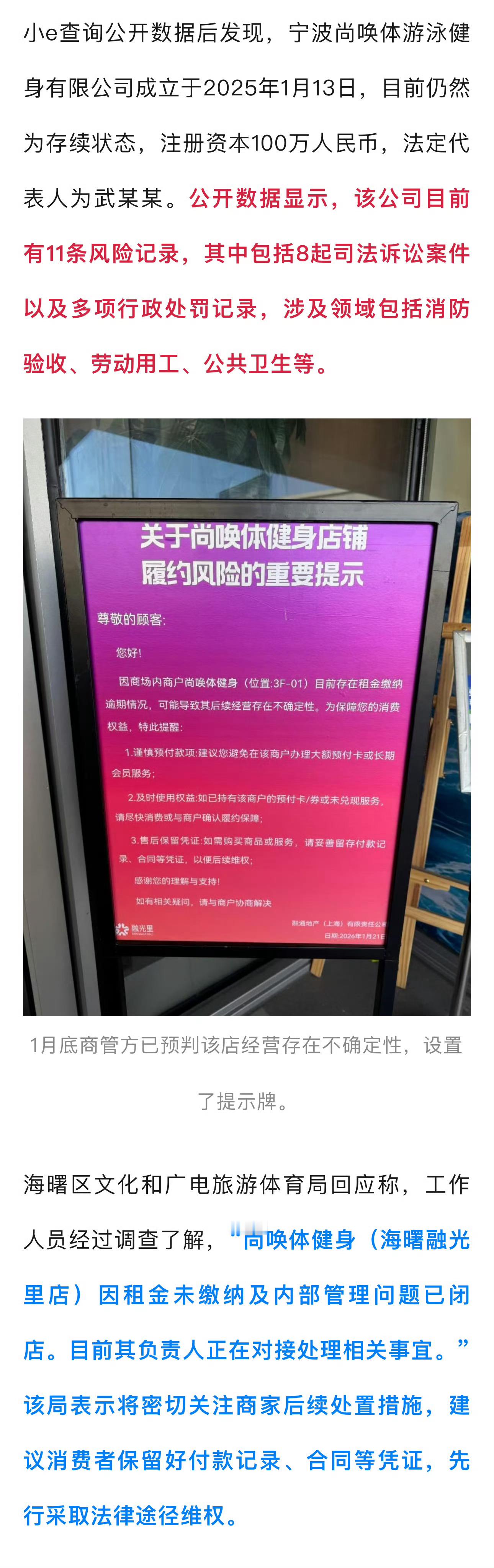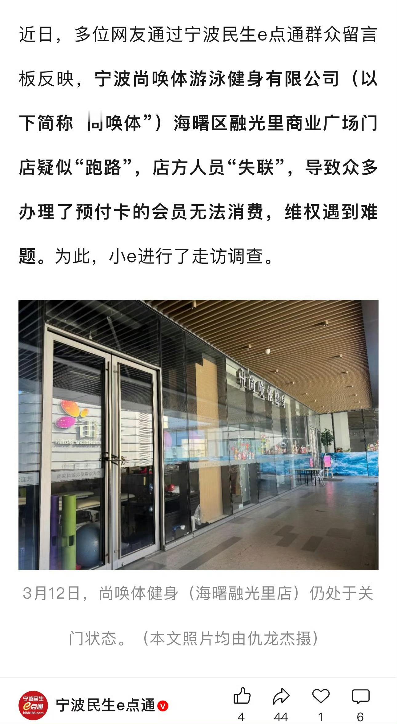 近日,多位网友反映,宁波尚唤体游泳健身有限公司海曙区融光里商业广场门店疑似“跑路”店方人员“失联”,导致众多办理了预付卡的会员无法消费,维权遇到难题…据网友反映,位于海曙区融光里商业广场3楼的“尚唤体”游泳健身中心,自今年2月下旬起便一直处于闭店状态,未恢复营业。“我们很多会员充值办理了4580元的年卡,现在店彻底关门了,人也联系不上,不知道找谁去退钱?”陈女士很是忧心。