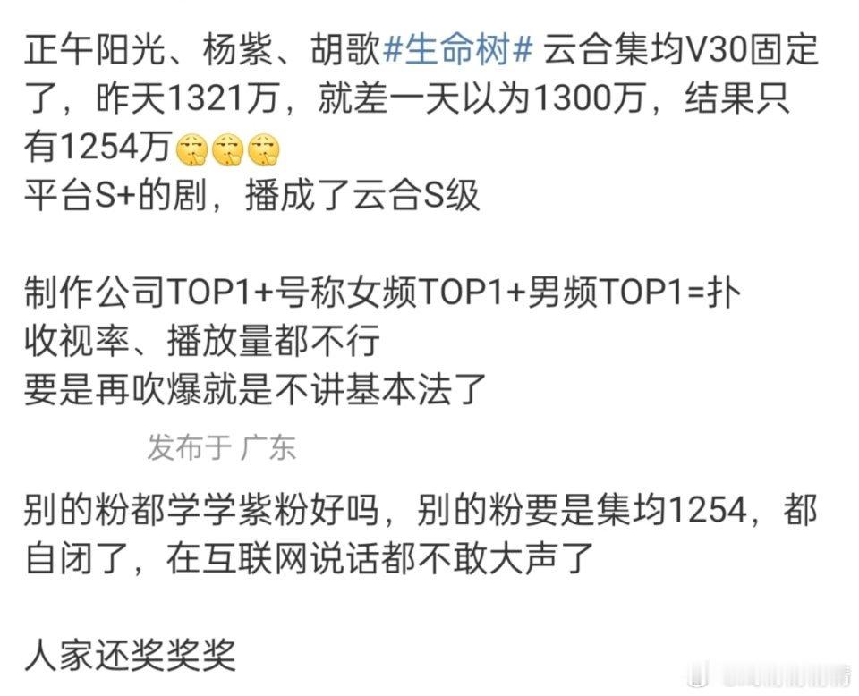 杨紫、胡歌的生命树云合集均1200,豪华阵容班底就这,网友点评:收视率、网播、口碑三扑,女主演技稀烂,内娱史诗级血扑大烂剧,长句反面教材。你怎么看?