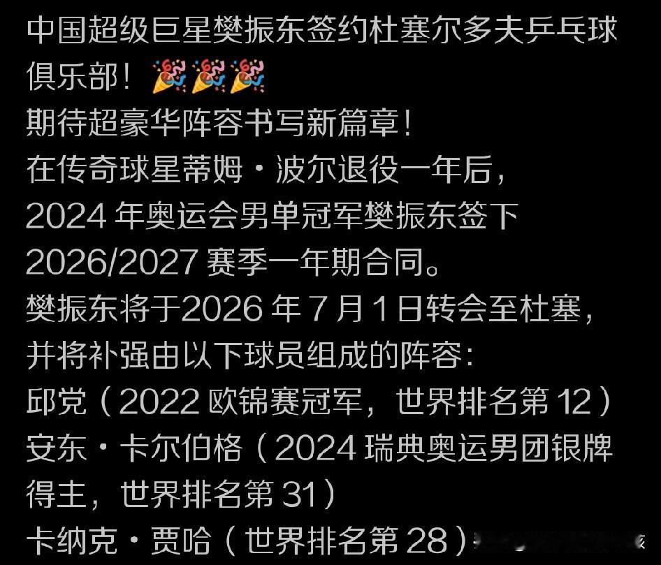 相信很多球迷都看到了,在德甲乒乓球联赛的赛场上,樊振东为杜塞尔多夫萨俱乐部拿到非常突出的成绩之后,他将转而投奔萨尔布吕肯俱乐部,为这支球队在新赛季效力,开启自己的另一段职业生涯新旅程。而且这支球队当中也拥有多位世界知名球星,比如德国的。本土球员邱党,还有来自瑞典的名将卡尔伯格,再加上还美国高手卡纳克-贾哈的加盟,这样的一个团队也能让我们看出整个球队的阵容厚度。 即使球队当中的知名老将波尔上个赛季选择退役和告别职业生涯,但少了波尔的萨尔布吕肯依然会是德甲联赛当中属于实力上乘的团队,也将成为联赛争冠热门。 从某种角度上来说,即使有些球迷不是十分理解樊振东的选择,但他现在确实是既享受比赛,又让自己可以充满动力的情况下去让自己总有新的目标来实现新的进步和突破,同时这种进步和突破又不至于让自己压力过大,还能展现自己的整体竞争力和大赛气场的同时,确保让樊振东能保持竞技状态,万一真的回归乒乓国家队,樊振东也还能适应得了新的奥运周期对自己的要求和期待。 当然,这种选择也对樊振东本人而言是一种很好的职业生涯选择模式,既可以让自己保持很好的竞技状态,又让自己不至于压力过大,同时还能有助于他的学业完成,包括个人身份的逐步转换。 比如现在这种阶段,樊振东就既可以和不同风格的队友一起合作,并和不同风格的对手去进行交锋,然后充分享受乒乓球给自己带来的快乐。也许,曾经在国乒团队当中的那些经验和教训,包括所有的经历,已经成了樊振东身上最大的一笔财富。他也会用自己的方式把这种财富发扬光大。 只是,即使我们很尊重樊振东未来的个人职业生涯选择,但当看到现在的国乒团队在第二甚至第三主力人选的竞争力形成方面的确问题比较明显时,我们也很期待如果可以的话——樊振东最终还可以重新回归国乒团队,为这个团队继续做贡献。 当然现在没人会对樊振东给予过多苛责,我们也支持他的一切选择,愿他在德甲联赛当中不断享受比赛的快乐,也能真正为整个世界乒乓球的发展做出自己的一份贡献。不管他是否选择重新回归男乒国家队,我们都将带着对樊振东的支持和尊重期待着他用自己的方式给世界乒乓球的发展继续做出自己的一份贡献。 加油,樊振东。真的像有些球迷说的那样,你到哪里,我们也会跟着看哪里的比赛,希望这样的支持可以继续帮助你享受乒乓球带来的快乐!