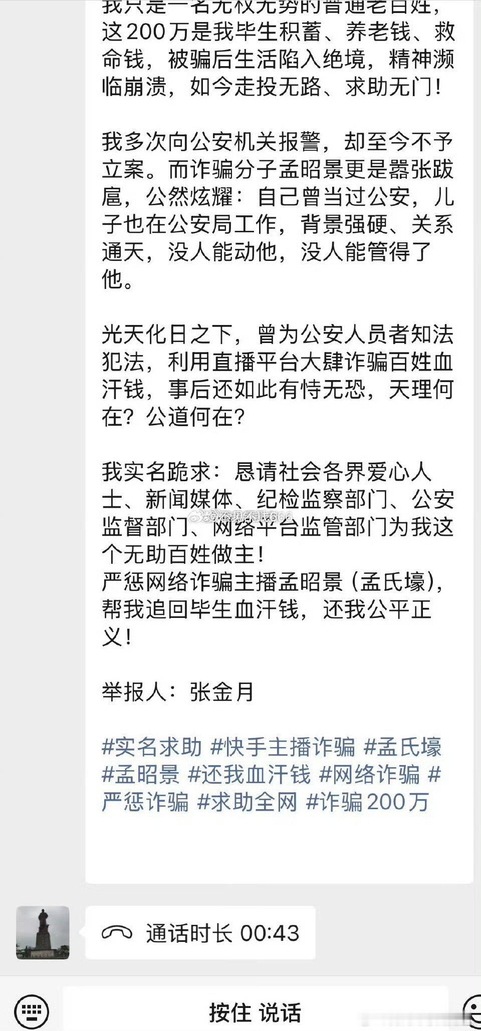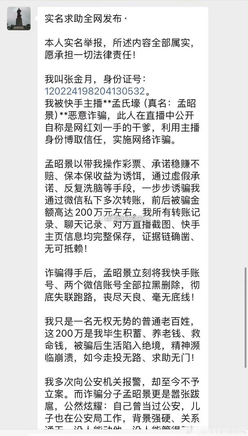 快手网红“刘一手”干爹“孟氏壕”被实名举报,该主播以买彩票直播间预测给号的形式:Z骗张金月200万余元。承诺稳赚不赔,张金月对此实名举报。该主播孟氏壕多次声称有gong安背景据悉:快手主播孟氏壕以在快手豪刷而出名。还是千万网红刘一手的干爹。吸引粉丝以后,在直播间实施带粉丝买彩票“稳赚不赔”的虚假承诺。建议有关部门严查。