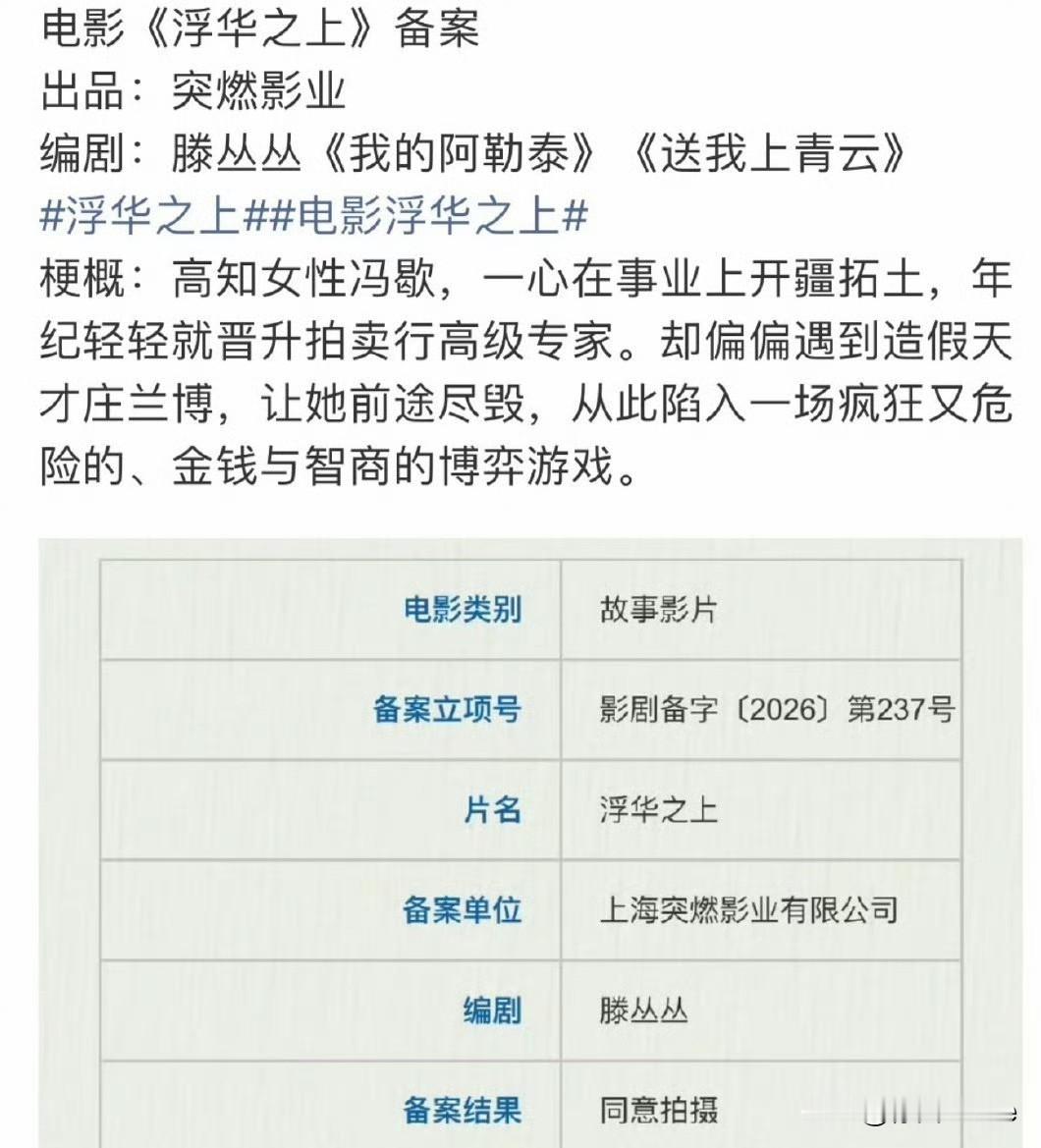 赵丽颖辞演《开盘》,停工数月,原来是在等它!电影《浮华之上》成功备案,赵丽颖将饰演高知女性拍卖行高级专家冯歌,搭档于适,于适饰演造假天才庄兰博!目前看来,赵丽颖对电影的热情要比电视剧好很多,《开盘》对标的是视后,《浮华之上》对标的是影后,视后赵丽颖拿了不少