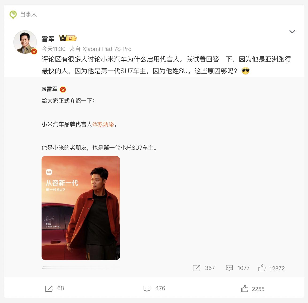 苏炳添官宣代言小米汽车 官宣:苏炳添成为小米汽车代言人!雷军还解释了为什么让苏炳添当代言人:“ 因为他是亚洲跑得最快的人,因为他是第一代SU7车主,因为他姓SU。” 雷军回应为什么让苏炳添当代言人