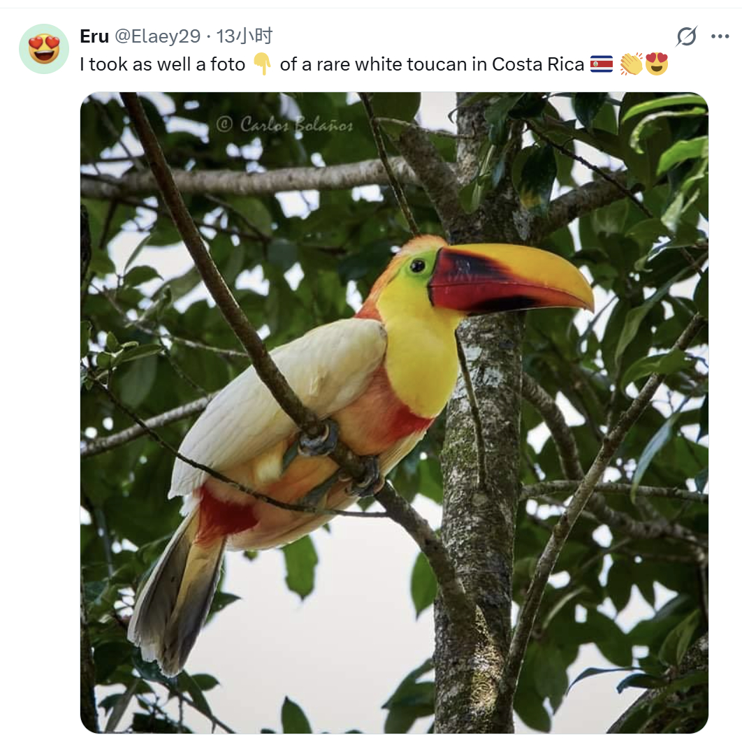 摄影师在哥斯达黎加拍到的一只颜色特殊的巨嘴鸟~~后来评论里有人说自己也在那里拍到