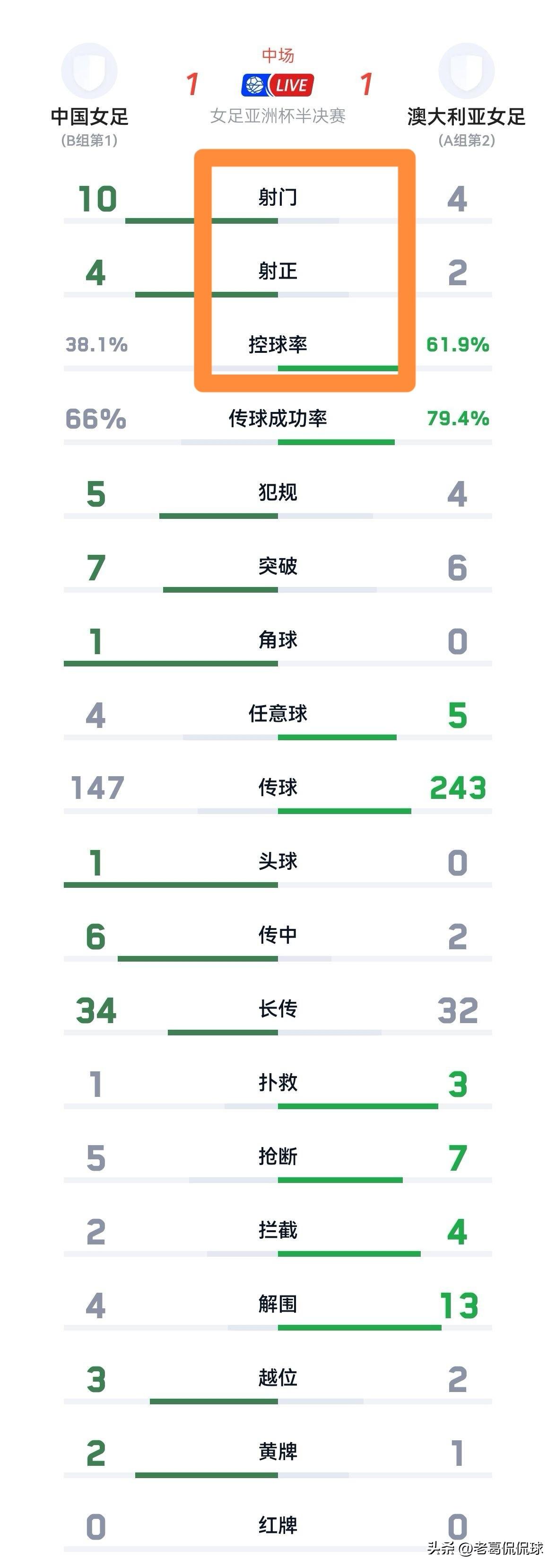 中国女足真是完全不落下风!在今天进行的中国女足和澳大利亚女足的亚洲杯半决赛中,目前双方半场战罢,两支球队战成了1:1平。在上半场比赛中,虽然中国女足在控球率方面远远不如澳大利亚女足,但是从比赛场面来看,中国女足不仅丝毫不落下风,而且还具有一定的优势。 从数据统计来看,在上半场比赛中,中国女足在射门次数和射正次数方面都要高于对手,这足以证明中国女足在立足防守的情况下敢于积极主动的进攻。 以目前的情况来看,只要中国女足在下半场比赛中坚持自己的打法和策略,那么最后的胜利必将属于中国女足。