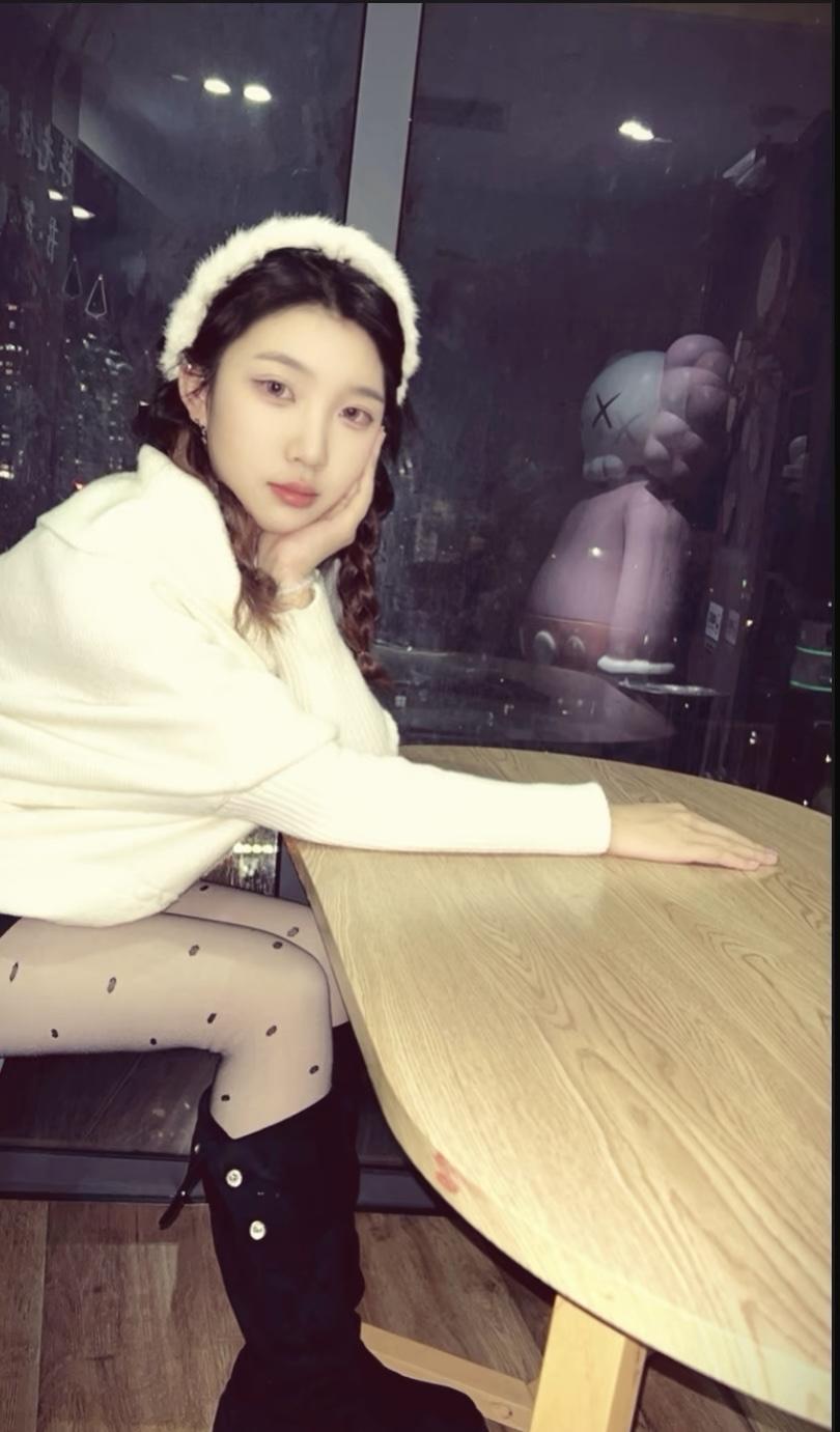 小妖精张纯烨,黑色西装短裙,搭配丝袜美腿妆造。张纯烨