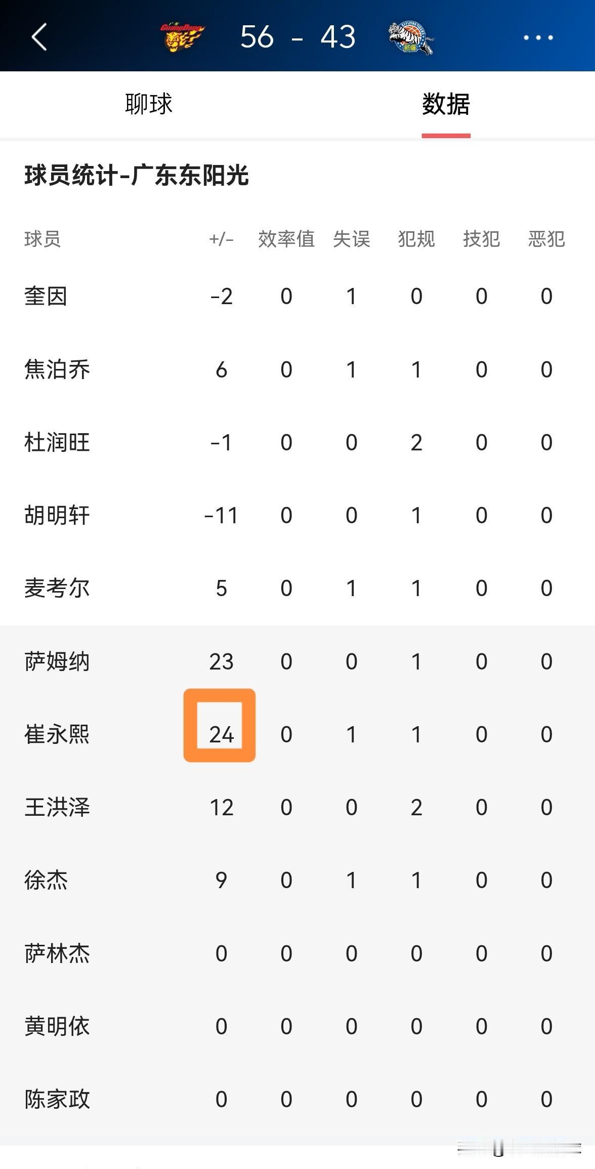 广东东阳光大将崔永熙终于彻底的苏醒了!在今天广东东阳光主场迎战新疆伊犁特的焦点战中,目前双方的上半场比赛已经结束,广东东阳光以56:43领先对手13分。让人感到无限欣喜的是,那个攻防兼备的崔永熙彻底的苏醒了。 在前两节比赛中,崔永熙替补出战8分钟,三分球3中2,其中罚球5中3得到9分,还有2篮板2助攻,他的场上正负值为全队最高的+24。 随着崔永熙的状态越来越好,广东东阳光又看到了夺冠的希望。
