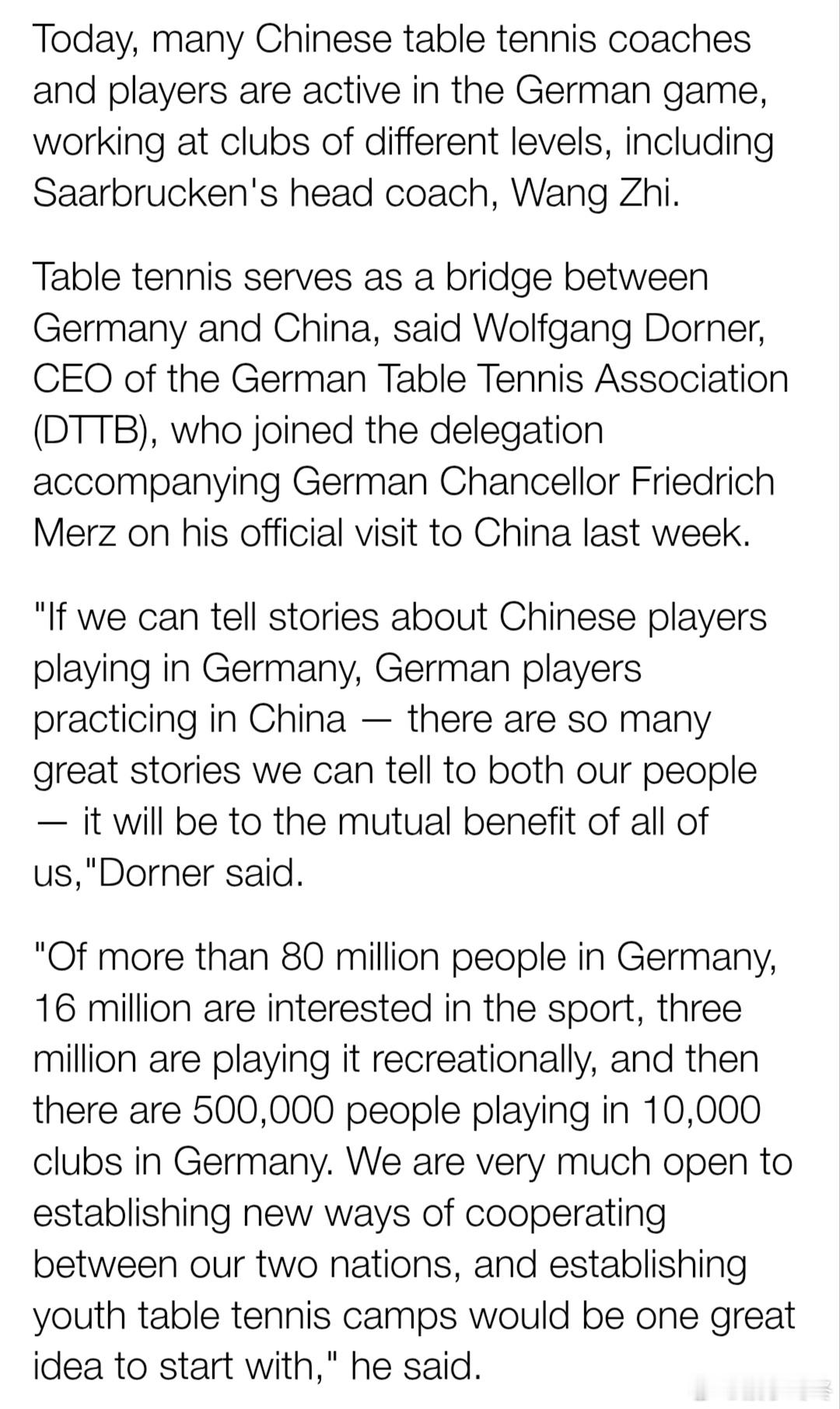 德国乒乓球协会(DTTB)首席执行官沃尔夫冈·多纳表示,乒乓球是德中两国之间的一座桥梁。上周,他随德国总理Friedrich Merz 的代表团对中国进行了正式访问。