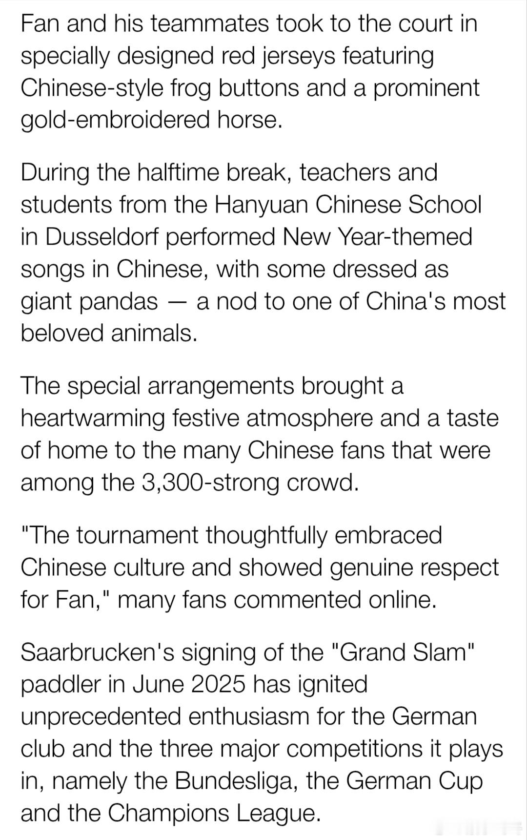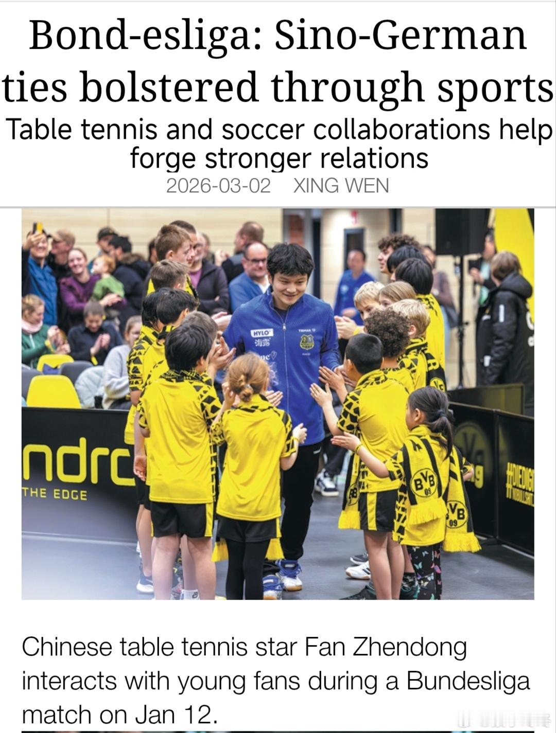 樊振东让乒乓球这项运动熠熠生辉波尔夸赞樊振东是史上最佳驻法兰克福总领事观战樊振东樊振东不愧是中德友谊之桥樊振东 2026年3月2日《China Daily》刊登:《Bond-esliga: Sino-German ties bolstered through sports——Table tennis and soccer collaborations help forge stronger relations》德甲联赛:体育助力中德关系升温乒乓球与足球合作助力打造更紧密关系
