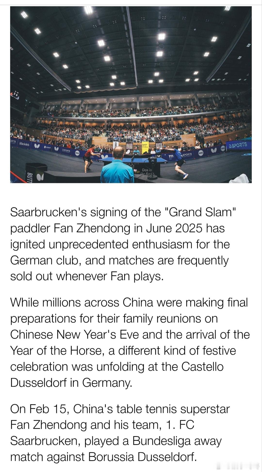 2025年6月,萨尔布吕肯签下“大满贯”选手樊振东,这一举措点燃了这家德国俱乐部前所未有的热情,只要樊振东参赛,比赛门票常常一售而空。
