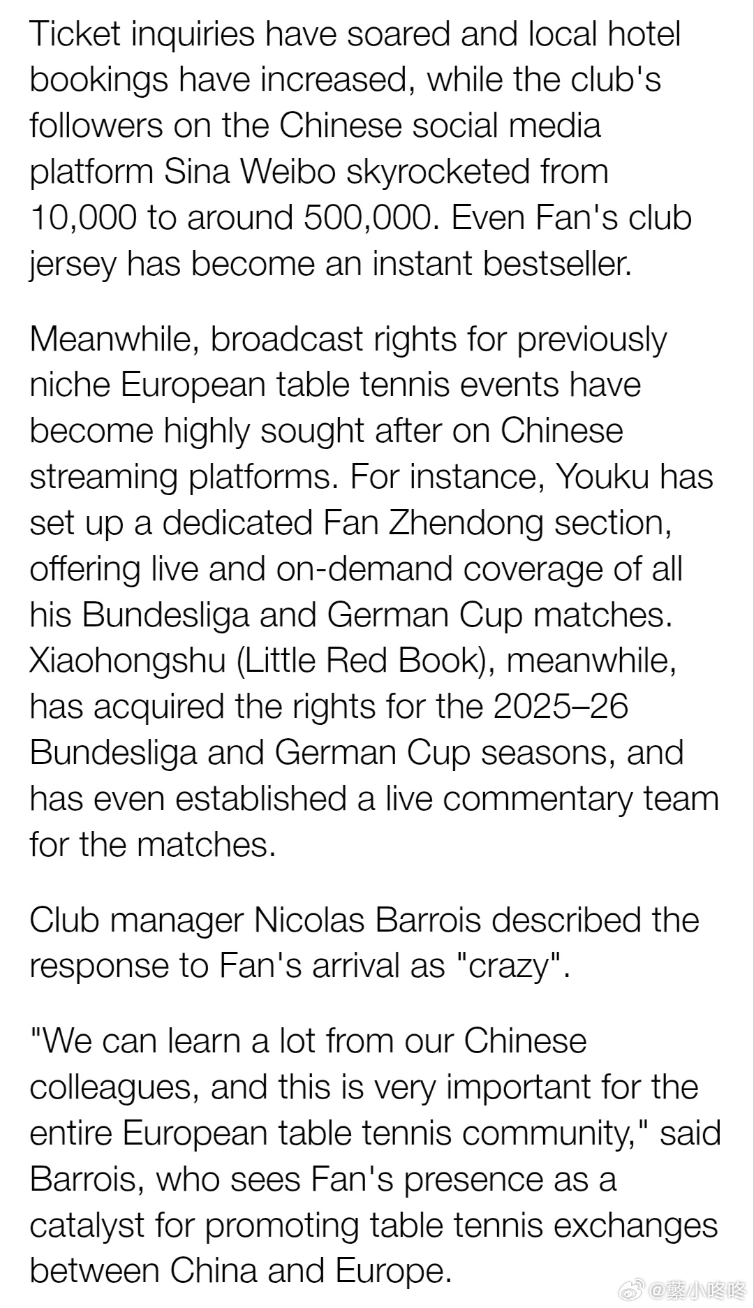 门票咨询量飙升,当地酒店预订量也有所增加,该俱乐部在中国社交媒体平台新浪微博上的粉丝数从1万猛增至约50万。就连樊振东的俱乐部球衣也瞬间成为畅销品。