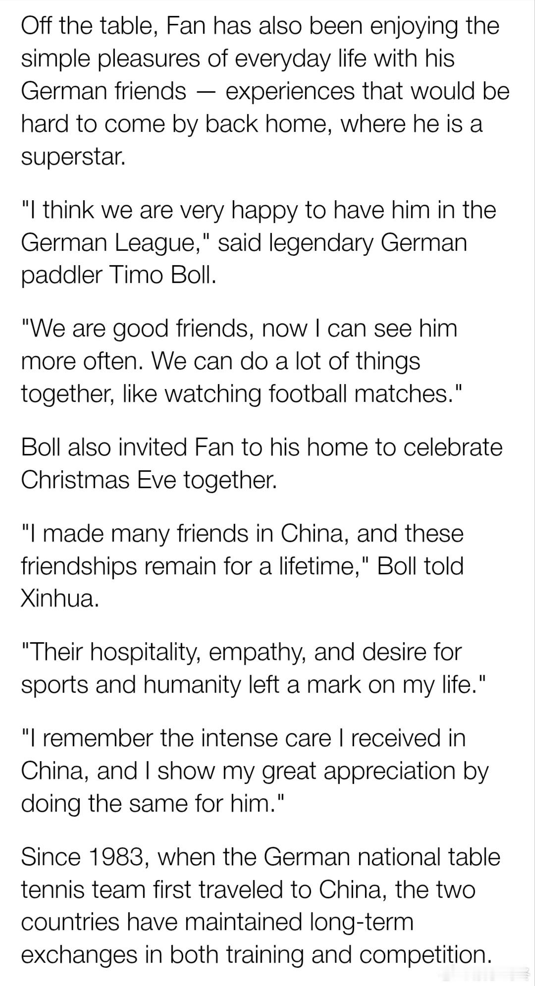 赛场之外,樊振东也和他的德国朋友们一起享受着日常生活中的简单乐趣——这些经历在他的家乡是很难获得的,因为在那里他是超级明星。