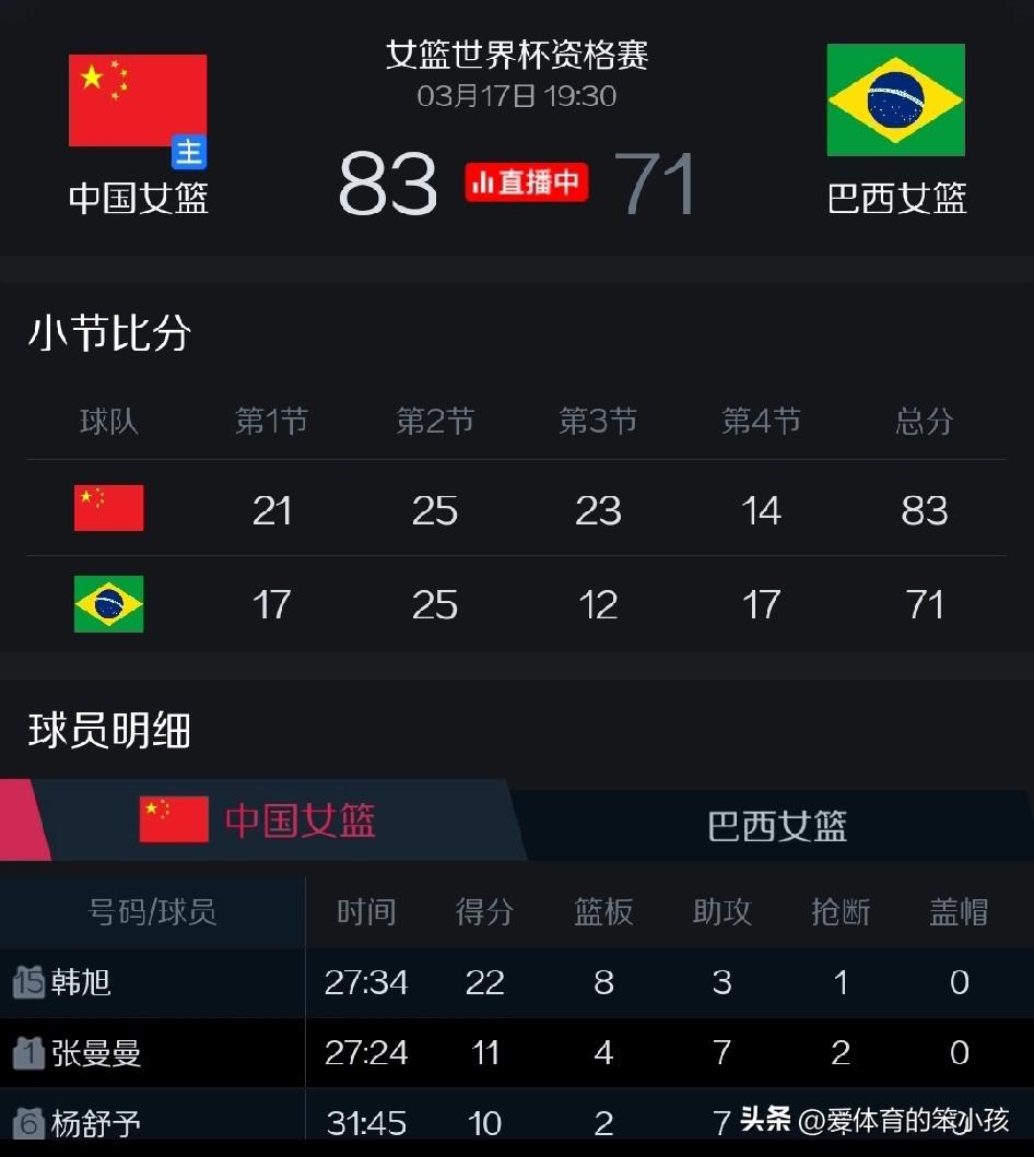 女篮世界杯预选赛的赛场上,中国女篮国家队在最后一场与巴西女篮的强强对话当中,展现出了很好的竞争力,特别是在对方如果战胜中国女篮也将拿到一个世界杯参赛名额的前提下,中国女篮不但没有放水,而且在这场影响对方出线及晋级命运的比拼当中,还是打出了自身的状态和实力,甚至造成了对方在场上的心理起伏过于明显,场上发挥不够出色,连对方阵中核心卡多佐也被打到五犯离场,这也让中国女篮不但拼下一场比赛胜利,还赢了对方12分。 双方四节的具体得分比为21:17,25:25,23:12和14:17,而四节比赛结束及全场比拼完成时的比分则定格在21:17、46:42、69:54和83:71。 也就是说,中国女篮在这场比赛中最后是以12分优势胜出,在比赛结束后的第一时间,此役的MVP获得者中国女篮的内线核心韩旭,也是在拿到22分8篮板3助攻的全面数据之后,面对央视记者的采访专门提到: 中国女篮在这场比赛当中有更多的人能站出来,在球队需要胜出的时候去贡献自己的一份力量,是这场比赛的一大亮点。 另外,中国女篮年轻的球员们也是逐步在比赛当中展现出个人价值,分担一些老队员和关键队员的责任和义务,体现出了中国女篮现在的综合进步。 另一点来说,韩旭还专门谈到中国女篮在前三节打的比较精彩,也比较出色的情况下,虽然第四节一度被对方打出得分高潮,甚至一度让中国女篮面临好几分钟只拿1分对方却拿了8分的不利形势,比分也被迫近到62:70只差8分,但是中国女篮还是顶住压力,可以通过暂停调整以及球员们自身的心态和状态变化来让场上的形势得到改观。 也就是说这种迫近比分的形势虽然逼人,但后面中国女篮的球员们还是重新稳住局势,没有让对方把分差进一步迫近。中国女篮也在后面的暂停调整回来之后,利用对方心理起变化打得不够合理的机会重新稳住局势,第四节单节虽然14:17输了3分,但仍然守住了前面的胜果,没有让热身赛上那种被对方打出气势,甚至反超比分最后让双方打加时赛的情况再度上演,最终也实现了83:71的12分优势胜出。 让我们在这里恭喜中国女篮,也期待着大家在拿到9月4日到13日进行的柏林女篮世界杯的一张入场券和门票之后,可以很好的享受国内联赛还有近期即将到来的明星赛的比赛任务对自己的要求,并全力以赴争取到女篮世界杯的赛场上展现更好的实力及状态,并力争在那样的赛场上拿到更出色的成绩。 这次女篮世界杯预选赛,中国女篮在比利时女篮之后以4胜1负的战绩位列晋级球队的第二位,也是证明了球队的实力。全队在实战当中不断调整和磨合的结果也是初见成效。期待着大家在看到问题和不足,也看到成绩和突破的同时,还带着一颗平常心去做好之后的各种备战,以争取到世界杯真正到来时,能有更好的成绩方面的呈现。 最后让我们再次祝贺中国女篮和韩旭本人。也感谢韩旭的其他队友,特别是此役得分上双的王思雨、张曼曼,还有杨舒予。相信他们在未来的赛场上还能继续让我们见证他们的精彩!