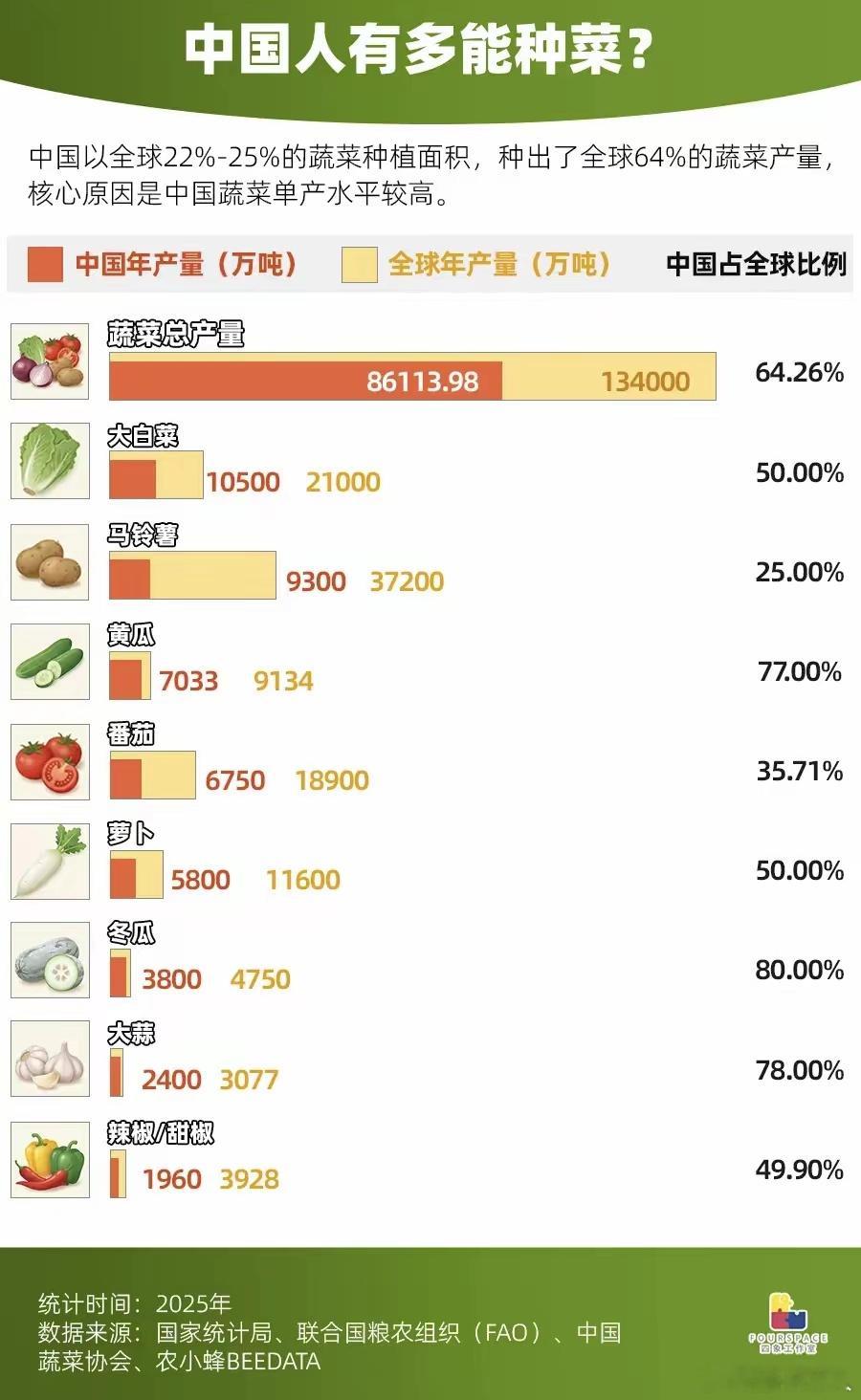 我们才是种菜世家啊。中国居然种了全球64%蔬菜,而且主要是自己消费,所以让人均消费是全世界都2倍多。韩国蔬菜价格基本上是中国近4倍,但是韩国人均可支配收入远达不到中国4倍。难怪韩国吃饭就是一大桌子咸菜啊。