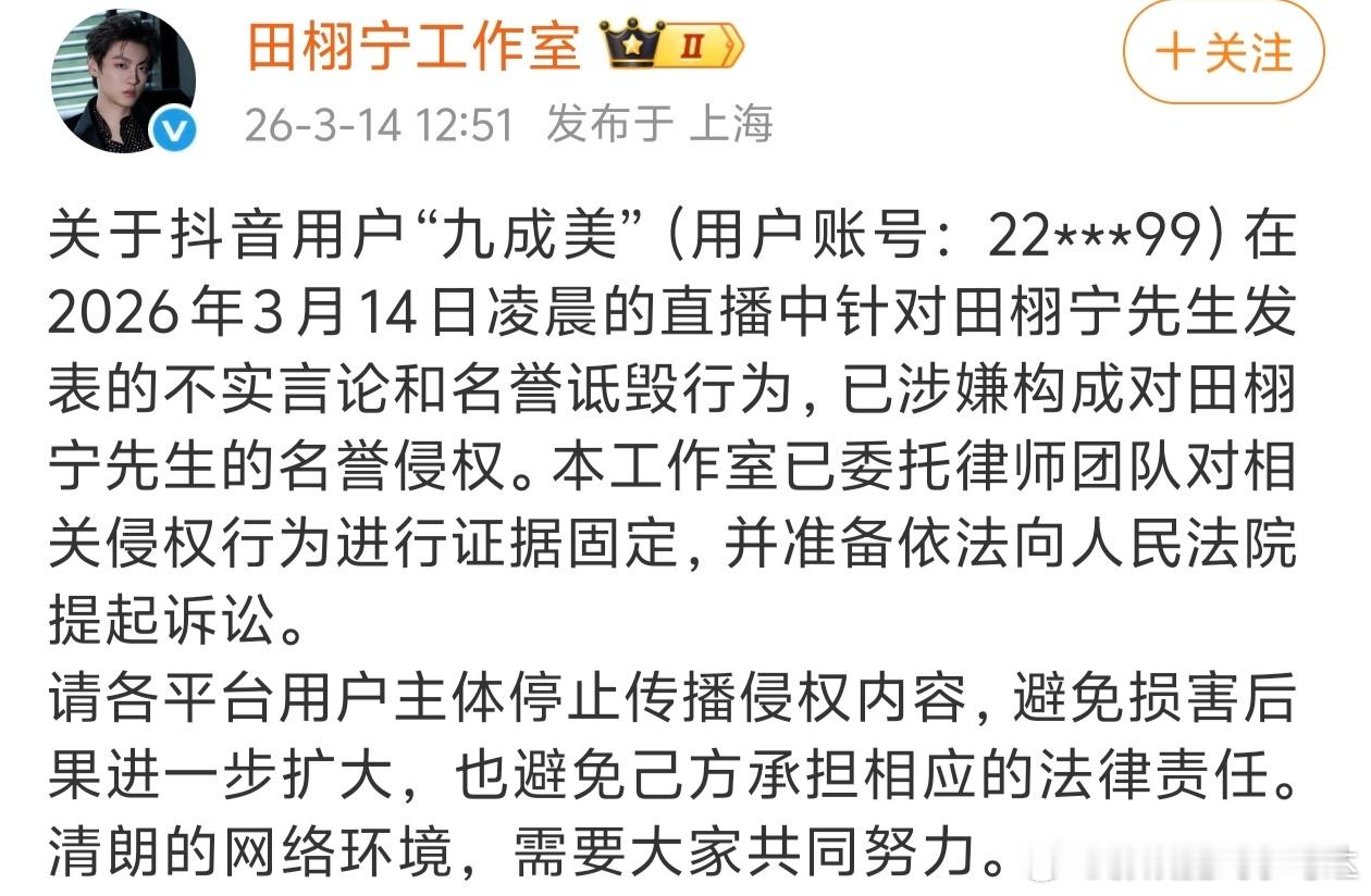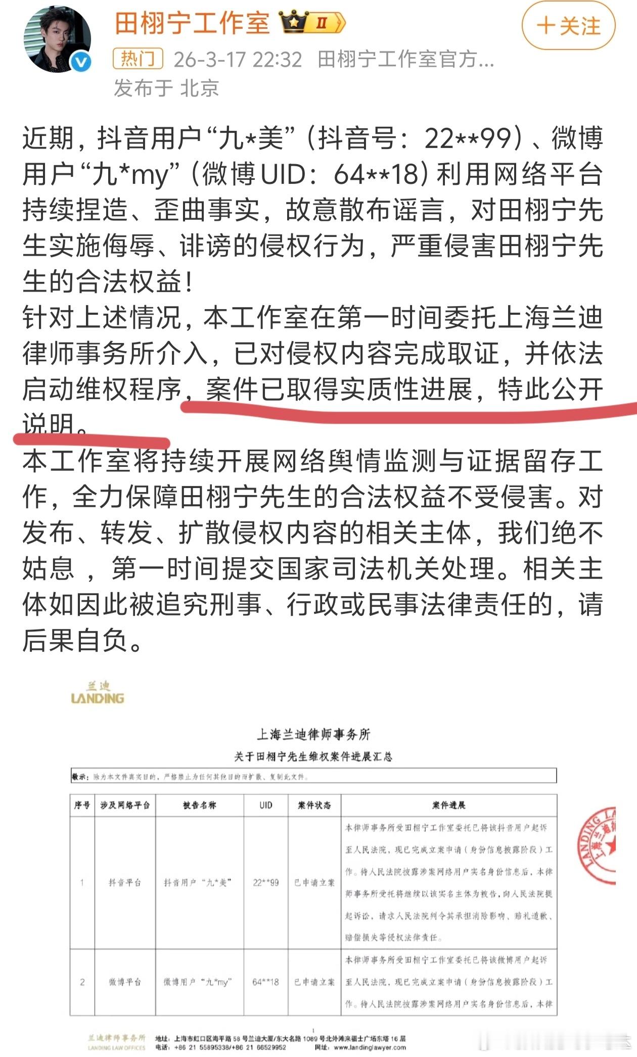 继田栩宁工作室前几天针对九成美事件进行名誉维权后,九成美继续发微博分享和田栩宁在一起的相册,并且开了直播。这次田栩宁工作室又告了九成美,根据田栩宁工作室声明称,案件已经取得实质性进展↓↓这是属于特别强调了吧
