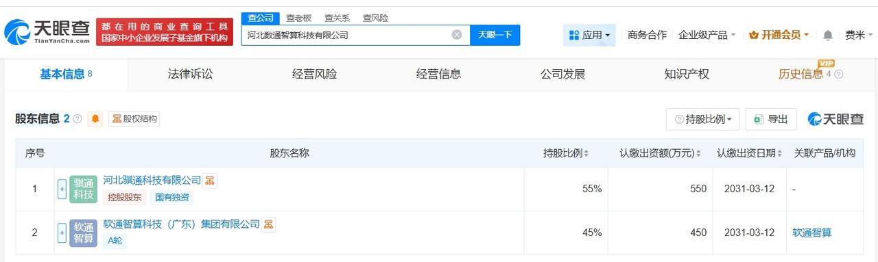 软通动力等在河北成立智算科技公司 注册资本1000万 天眼查App显示,近日,河北数通智算科技有限公司成立,法定代表人为曹伟,注册资本1000万人民币,经营范围包括数据处理和存储支持服务、人工智能公共数据平台、云计算装备技术服务等。股东信息显示,该公司由河北骐通科技有限公司、软通动力(301236)旗下软通智算科技(广东)集团有限公司共同持股。 天眼查信息: