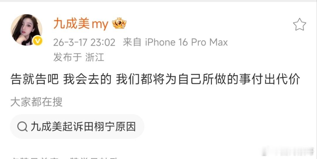 田栩宁工作室告了九成美 九成美回应会去出庭讲清楚他和田栩宁的事,并说大家都将为自己所做的事付出代价。小美姐,开庭时我能和你一起去吗,在上海或杭州我都能有时间,坐在旁听席旁听就行了