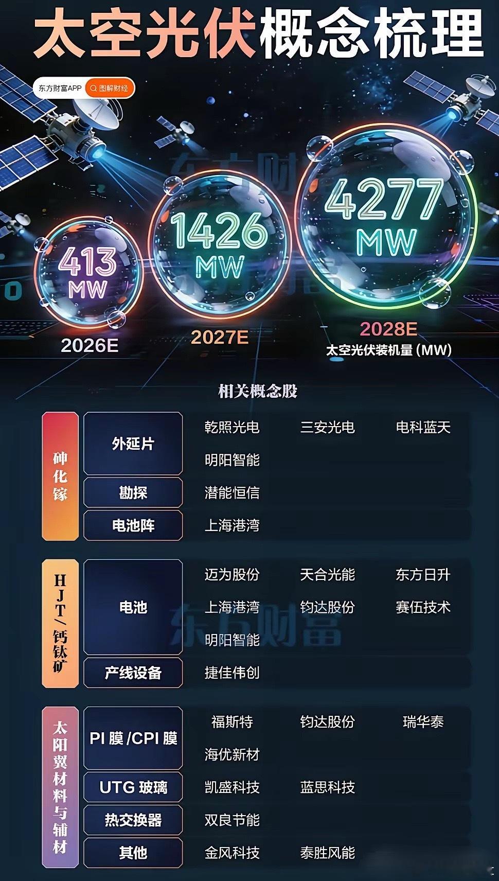 黄仁勋引爆太空光伏!三年装机暴增十倍,概念股全清单美国当地时间3月16日,英伟达GTC大会上,黄仁勋正式宣告"太空计算时代到来",推出Space-1 Vera Rubin等太空计算平台,搭载Rubin GPU的太空AI推理算力较H100实现最高25倍性能飞跃 。这一重磅消息直接点燃光伏板块,周二华民股份涨超10%,国晟科技、协鑫集成等涨停,易成新能、福斯特等强势跟涨。算力卫星的功耗革命是核心催化剂。一颗英伟达GB300芯片功率达1.4kW,8卡机柜整机功耗14kW,而Blackwell和Rubin架构功率飙升至132kW、240kW,算力卫星单星功率或远大于传统卫星。SpaceX V3卫星单星功率已达57-76kW,国内正全力冲刺50-100kW级超大功率电源系统。国金证券研报预测,2026-2028年全球太空光伏装机量将达413/1426/4277MW,三年装机暴增超10倍 。中邮证券指出,技术路线迭代带来新机遇,砷化镓为当前主流,HJT方案依托成熟晶硅产业大幅降本,钙钛矿叠层则是中长期核心方向。核心概念股梳理- 电池龙头:乾照光电(砷化镓电池龙头,市占率超60%,订单排至2028年) ;东方日升(50μm超薄HJT太空电池量产,占星链30%采购);天合光能(全技术路线覆盖,钙钛矿叠层专利全球第一) 。- 技术先锋:钧达股份(钙钛矿叠层效率33.53%,参股布局太空能源);隆基绿能(钙钛矿-拓普康叠层组件获20亿订单)。- 设备材料:迈为股份(SpaceX 5亿美元HJT设备框架协议);云南锗业(航天级锗衬底核心供应商,市占率超90%) 。太空光伏已从概念走向现实,2026年作为商业化元年,行业正迎来黄金发展期。