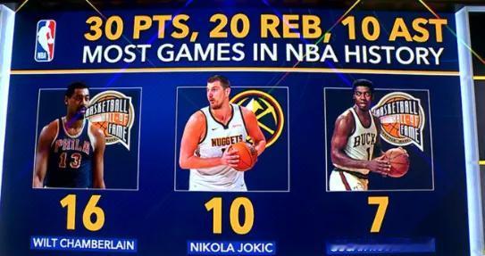 各种匪夷所思的东西 张伯伦都要出来走几圈。约基奇生涯至今已经10次单场砍下30+得分20+篮板10+助攻,他排在这项数据的历史第二,第一是威尔特-张伯伦的16次,第三奥斯卡-罗伯特森7次。没办法,大帅的身体素质放现在都是怪物级别的,更不用说在那个平均身高和运动能力远不如今天的蛮荒时代,即使忽略技术光硬碾都能碾过去了!