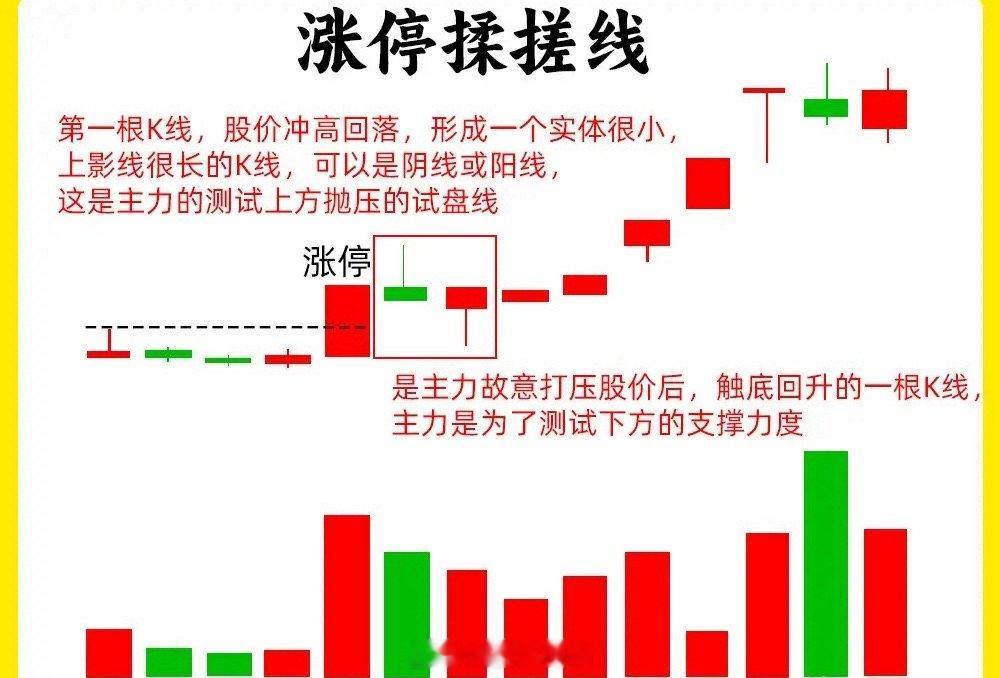 先出现一根实体涨停(或大阳线),次日冲高回落收长上影线(主力向上试盘,测试抛压),第三天探底回升收长下影线(主力向下试盘,测试支撑),两根K线形成“揉搓线”,且全程未跌破涨停板的关键支撑位(如阳线实体一半或最低价),同时成交量缩量。核心逻辑:上下影线是主力“双向试探”,既清理上方浮筹,又确认下方支撑,缩量+不破支撑,说明主力控盘能力强,后续突破概率大。