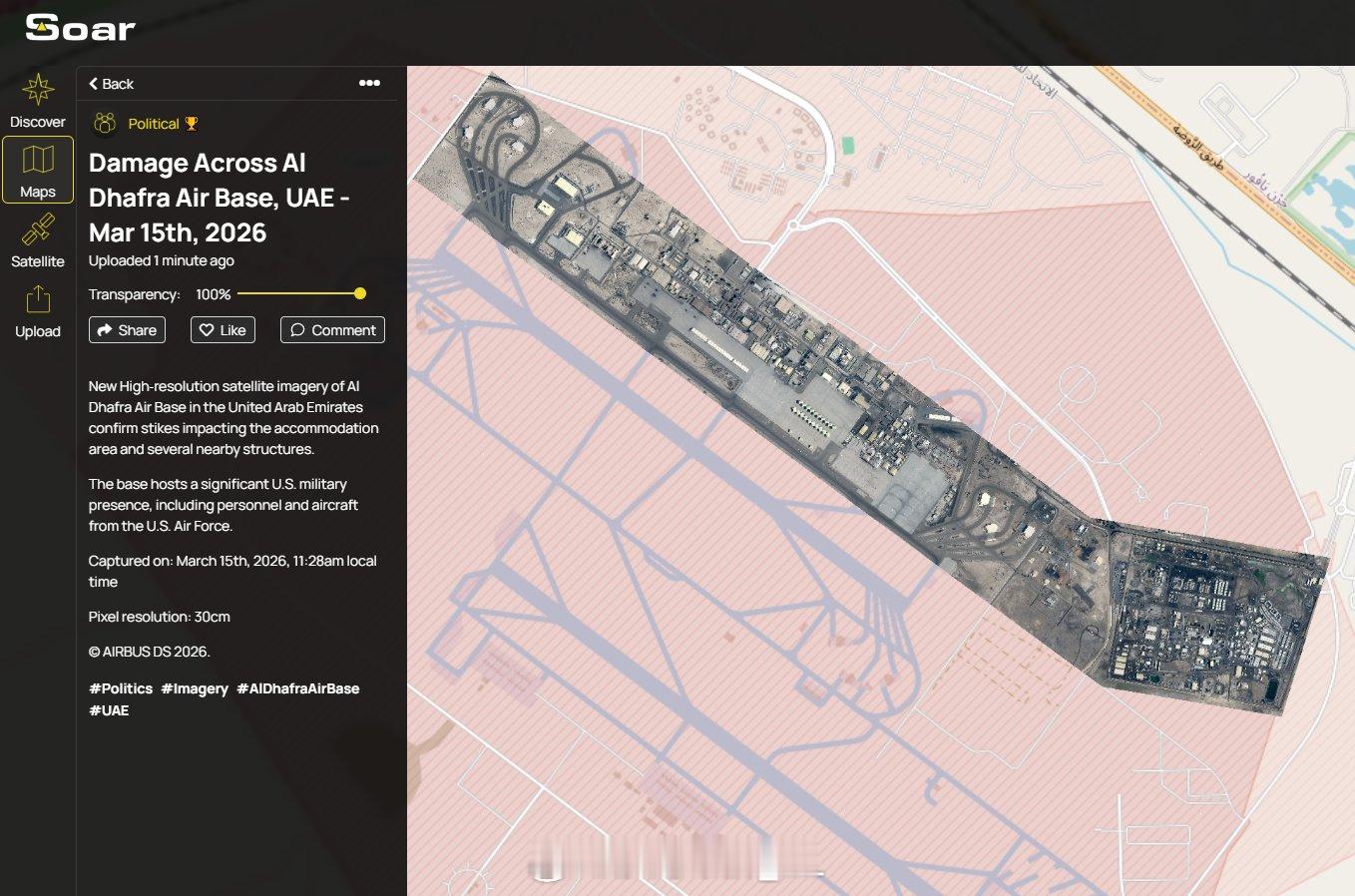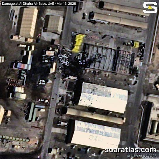 卫星图像确认了伊朗导弹与无人机打击对美军驻阿联酋达夫拉空军基地的严重破坏。