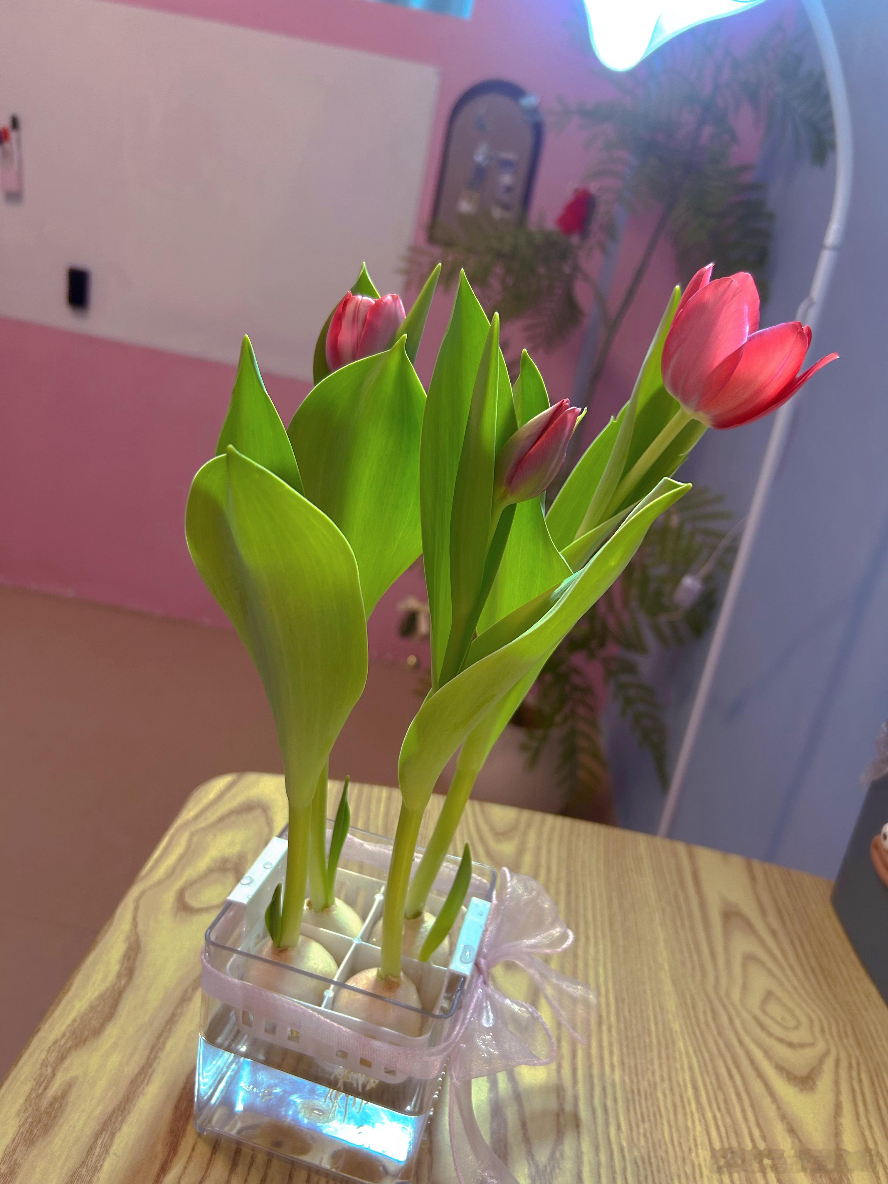 今天出门匆忙衣服乱搭的,没想到正好今天郁金香开花,和我裙子一个颜色,没画眼妆真的