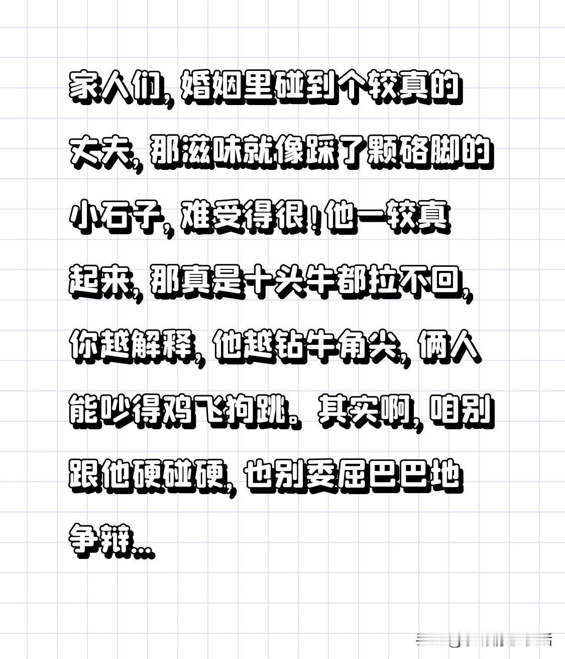 家人们,婚姻里碰到个较真的丈夫,那滋味就像踩了颗硌脚的小石子,难受得很!他一较真起来,那真是十头牛都拉不回,你越解释,他越钻牛角尖,俩人能吵得鸡飞狗跳。 其实啊,咱别跟他硬碰硬,也别委屈巴巴地争辩。他较真那是性格使然,咱情绪稳住,话简单点说,别跟他内耗。小事上顺着他,让他感受点温暖;大事上守住底线,让他知道咱也不是好欺负的。 婚姻里哪有什么输赢,不消耗彼此才是王道。你越淡定,他就像拳头打在棉花上,没辙啦! 你家那位也这么较真吗?快来评论区聊聊,觉得有用就点赞收藏!婚姻相处感悟 对老公的无奈 婚姻现实吐槽 太较真的人