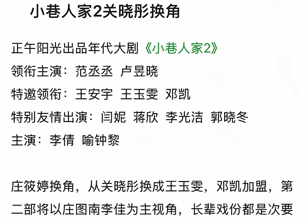 3月17日,《小巷人家2》关晓彤换角庄筱婷从关晓彤换成王玉雯,第二部将以范丞丞卢昱晓为主,长辈戏份都变次要了讲真与其庄筱婷从关晓彤换成王玉雯,不如索性找个借口说庄筱婷去山区支教了,王玉雯加入很突兀,王玉雯粉丝也不想王玉雯饰演这个挂件角色,没什么戏份不说,还容易被拉出来跟关晓彤对比,惹争议个人觉得也是,另外,长辈戏份其实是小巷人家的一大看点,还有几个小孩小时候的戏份,他们五个年轻演员的戏份其实不算特别出彩,如果这么改,不如换个名字,换部剧,把小巷人家这份美好留给观众!