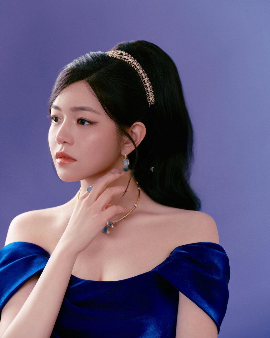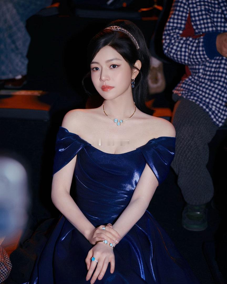 这套造型我直接封神!丝绒发带挽起蓬松半扎发,像极了复古画报里的名媛千金。藏青色缎面长裙在灯光下泛着柔光,高开衩设计让优雅中多了几分灵动。