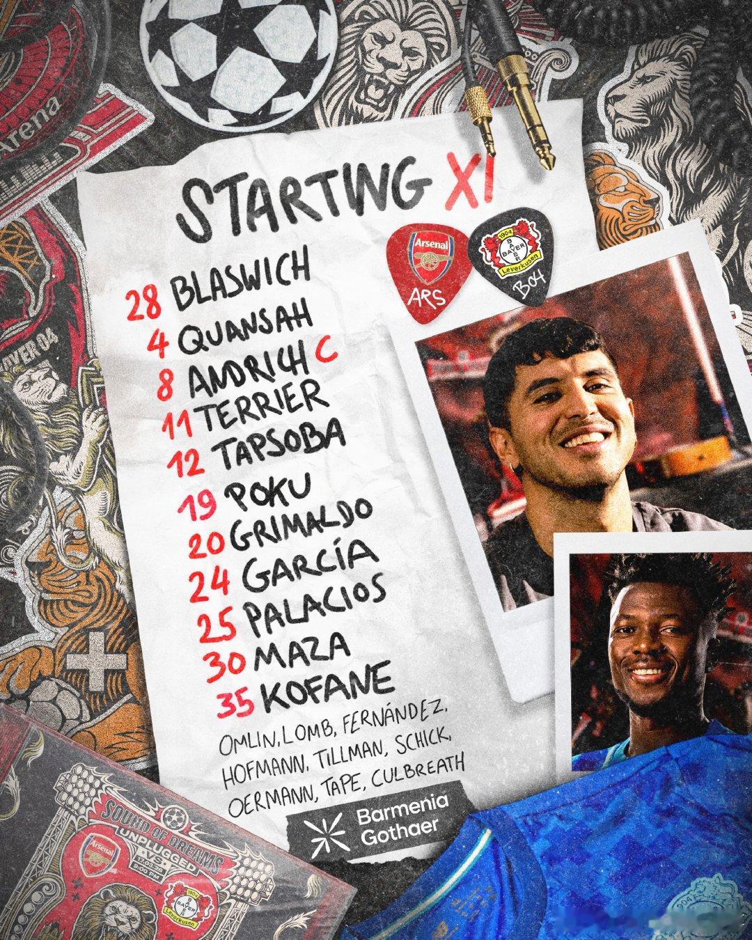 阿森纳vs勒沃库森 首发阵容⬇️ 4:00开赛!