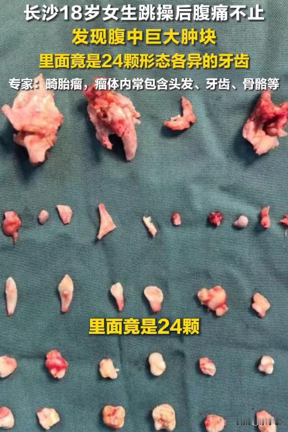 18岁姑娘跳完操疼得直不起腰,肚子里竟掏出24颗牙…看完我后背发凉 长沙这个18岁姑娘的事,真的看得我心里揪得慌。 早上刷到新闻,小姑娘平时爱跳操,那天跳完突然肚子疼得直冒冷汗,一开始还以为是岔气或者痛经,忍了半天实在扛不住才去医院。 一查CT,下腹部藏着个12厘米的大肿块,医生说大概率是畸胎瘤。等手术打开一看,在场的医护都愣了——里面不光有头发、油脂,还整整齐齐躺着24颗形态各异的牙齿,连牙根都清清楚楚,还有快5厘米的骨头。 我隔着屏幕都觉得瘆得慌,更别说这姑娘了,才18岁啊,好好的身体里揣着这么个“定时炸弹”,想想都后怕。 医生说这畸胎瘤大多是良性的,可要是没及时发现,一旦扭转破裂,那就是要命的事。很多姑娘跟她一样,一开始疼就当痛经忍,忍到扛不住才就医,差点耽误大事。 真的想跟所有姑娘说句掏心窝子的话:别拿身体硬扛,小腹疼、摸到肿块、月经乱了,千万别不当回事,早查早安心。 我们总觉得年轻就是资本,可身体从来不会骗你,那些被你忽略的小疼痛,可能都是它在拼命给你发求救信号。 愿每个姑娘都能被温柔以待,也愿我们都能好好爱惜自己的身体,别等出事了才后悔。 不明原因肚子疼 来姨妈了肚子疼 来月经肚子疼 不明原因肚子痛 右下腹隐隐作痛 孕晚期下腹疼 女生小肚子疼 来姨妈肚子痛