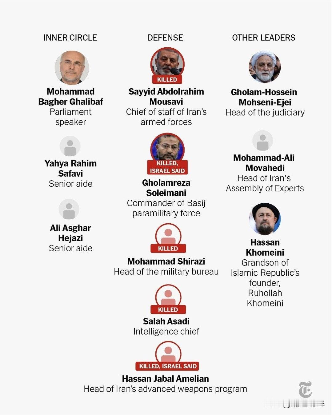 这是一幅清晰详尽的组织结构图,精准记录了自战争爆发以来,不幸殒命的伊朗高层领导人的相关信息。 图表最顶端是伊朗最高领袖哈梅内伊,他如同伊朗的精神灯塔和权力核心,在国家的政治与宗教领域占据着至高无上的地位。其下依次是伊斯兰革命卫队指挥官、圣城部队领导人、核科学家以及巴斯基组织负责人。 战争残酷无情,精准且冷酷地冲击着伊朗的权力架构。短短数周内,这些原本在各自领域叱咤风云的高层人物,竟接连殒命,生命戛然而止。 看着这张图表,不禁让人思考