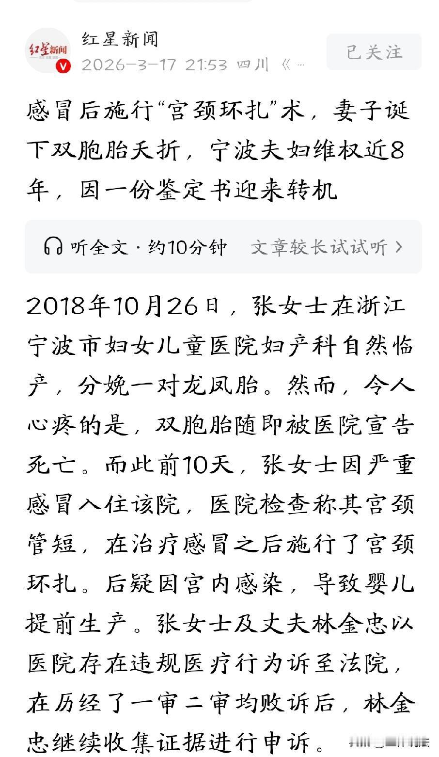 令人心痛!浙江宁波,女子怀孕22周时,因为感冒严重住院治疗,医院检查后说,她宫颈管短,需要立刻手术,不然会影响胎儿。女子吓了一跳,二话不说同意,在治疗感冒之后,施行了宫颈环扎。万万没想到,术后第三天,女子羊水突然破了,早产了一对龙凤胎,但感染严重,不幸夭折。夫妻二人悲痛欲绝,好好的孩子突然早产,他们怀疑是手术失误造成的,便将医院告上法庭,索赔380余万,但法院的判令人意外。 2018年10月,林先生永远不会想到,妻子怀孕22周时的一场普通感冒,会让他陷入一场持续近八年之久的医疗纠纷。 那年10月15日,妻子怀着龙凤胎,因为严重感冒住进了宁波市妇女儿童医院。林金忠心急如焚地陪着妻子做检查,结果出来后,医生的表情变得严肃。 医生表示,妻子的宫颈管短,需要马上做环扎手术,如果不做,胎儿很可能保不住。 林先生记得很清楚,医生特意提到主刀的是医院妇产科权威,手术流程简单。 他和妻子商量后,决定听医生的。 住院七天,妻子的感冒有了好转,10月22日下午,医院给张女士实施了宫颈环扎术,医生出来告诉他们,手术很成功。 可林先生的心并没有放下来,因为手术后,妻子的血压和体温一直居高不下,医院用了各种方法,就是降不下来。 10月25日晚上10点多,妻子的羊水突然破了。 第二天一整天,林先生都守在产房外,坐立不安。检测显示孩子的心跳正常,但妻子疼得死去活来。下午三点打了催产素,孩子还是没生下来。 晚上8点左右,产房的门终于开了,新生儿科的大夫走出来,说是一对龙凤胎。 林先生还没来得及高兴,医生又补充说∶男孩感染严重,体重太小,就算活下来也可能脑瘫,他们建议放弃治疗。 林先生站在走廊里,脑子里一片空白。他犹豫了大概半小时,每一分钟都像刀子割在心口。 最后,他含着泪在放弃抢救的同意书上签了字。 晚上10点,妻子从产房被送回病房,林先生想问孩子的情况,可看着虚弱的妻子,话到嘴边又咽了回去。 第二天,他准备去看孩子,睡着医生却告诉他,孩子已经不在了。 10月28日上午,医院催促张女士出院。林先生因为有事,下午赶到医院时,妻子已经办完出院手续,他立刻要求封存病历。 拿到病历复印件的那一刻,林金忠的手在发抖,病历上写的出院日期是30日,但他们是28日出的院。 更让他无法接受的是,病历上写着,两个孩子出生就没了。 明显不对,他记得清清楚楚,医生出来说孩子是活的,还让他签字放弃抢救。 他们认为,被告医院未尽注意义务,其过错医疗行为,造成胎膜早破、双胎早产,怠于救治,导致两新生儿死亡。 于是,林先生夫妇将医院告上法庭,要求赔偿医疗费、死亡赔偿金等近303万元,加上精神损害赔偿,总共近384万元。 法庭上,双方各执一词。 林先生坚持医院篡改病历,孩子出生时是活的,医院没有尽力抢救。 而医院的说法截然相反:张女士娩出的是死婴,林先生签字放弃抢救是事实,医院的诊疗过程符合规范。 争议的焦点集中在两个问题上:病历有没有被篡改?孩子出生时是活的还是死的? 法院审理后认为,现有证据显示,林先生的妻子张女士娩出的是死婴,医院不存在怠于救治的行为。 林先生夫妇要求做医疗鉴定的申请,没有被采纳。 2020年,一审判决驳回诉讼请求,2021年8月,二审维持原判。 林先生不服,他开始自己钻研法律和医学知识,一遍遍翻看妻子的病历,咨询专业人士。 好早功夫不负有心人,他发现了一个关键点:医院给妻子做的宫颈环扎术,到底有没有必要?手术和后来的感染、早产,有没有因果关系? 他把精力转向这个方向,四处寻找证据。 2025年1月16日,一份由北京明正司法鉴定中心出具的鉴定书,让这个案子迎来了转机。 鉴定意见清楚地写着∶医院对张女士的诊疗行为存在医疗过错,医方过错与其宫颈环扎术后并发宫内感染的损害后果之间存在因果关系,原因力大小为主要; 与其不足月胎儿流产的损害后果之间存在因果关系,原因力大小为次要。 拿着这份鉴定书,林先生看到了希望。 《民法典》第一千二百二十二条规定:患者在诊疗活动中受到损害,医疗机构遗失、伪造、篡改或者违法销毁病历资料的,推定医疗机构有过错。 医院存在出院日期与实际不符、新生儿存活状态记录矛盾等病历不实情形,依法直接推定医方过错。 结合司法鉴定中心的新证据,2025年10月11日,法院认定,判决确有错误,撤销原一、二审判决,发回重审。 等了快八年,终于等来了这一天,案件即将开庭,具体时间还没定。 如今,林先生已经46岁。回望这七年多,他说自己从一个对医疗和法律一无所知的外行,变成了半个专家。 支撑他走过来的,是他坚信,正义不会太远。