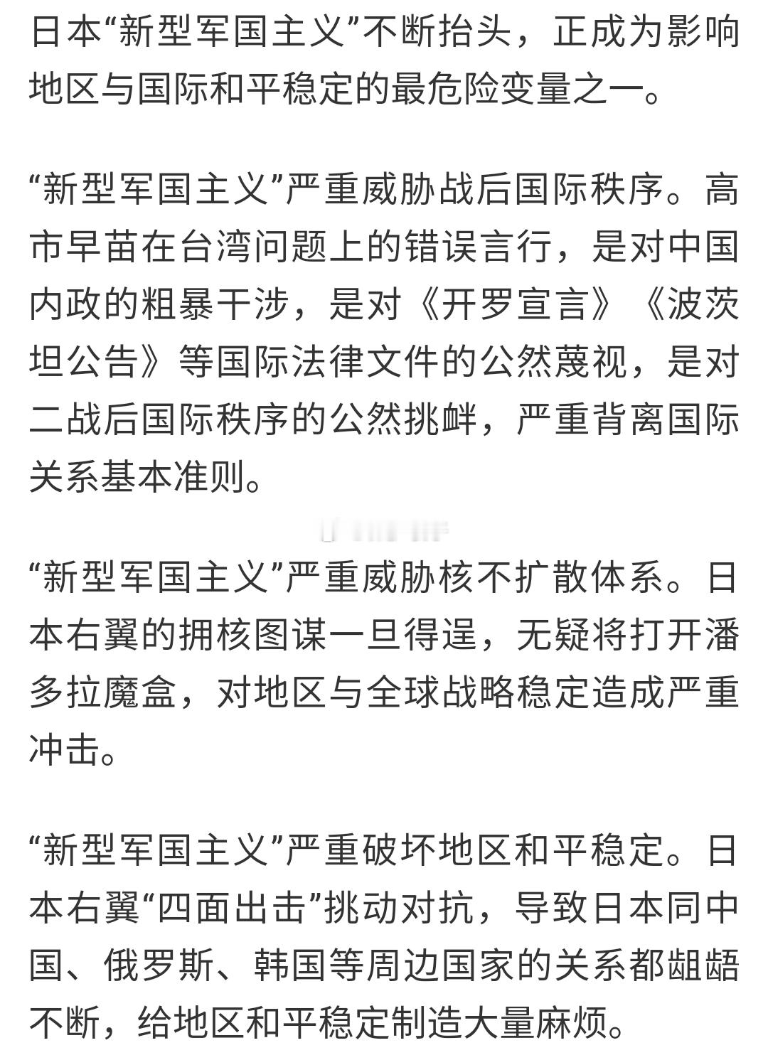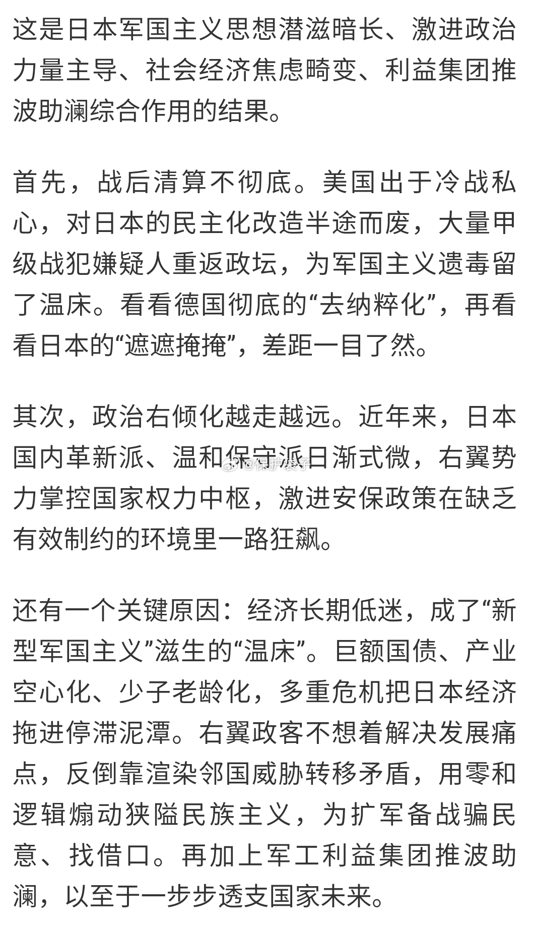 日本新型军国主义已是现实威胁与十九世纪初开始逐渐畸变的日本有相同也有不同: 不同之处在于上一次是黑船敲开了港口导致的日本自身激进起来,然后逐渐形成阴忍、下克上、赌上头后全民狂热的状态。这一次是经济外压下的发展压力,需要有一个转变,但却是上引导下,全民狂热的苗头还没完全出现,且人口结构老龄化带来的底气与之前非常不同。 相同之处在于之前是美国的船带来的引子,但后期却是自身为主。这次依然是美国引子,但更多是因为美国需要日本在东亚有这么个牵制而遇到日本自身的困境结合了。 但无论如何要警惕了,或许美国只是要求一个“牵制“不一定希望真出现需要自身都不得不介入的局部甚至更高规模的战争,但在日本自身容易不顾一切又喜欢偷袭的特点下,什么都可能发生。袋子时评